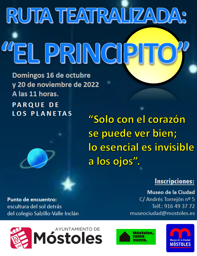 Vuelve la ruta teatralizada basada en el cuento de "El Principito", que se realizará a las 11:00 h en el Parque de los Planetas, con salida desde la escultura del sol junto al colegio Salzillo - Valle Inclán. Las inscripciones son gratuitas y pueden realizarse en el Museo de la Ciudad, a través del teléfono 91 649 37 72 y del correo electrónico museociudad@mostoles.es