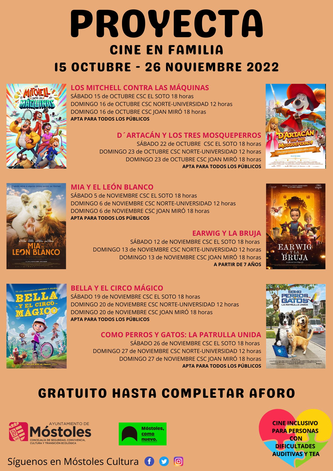 Las entradas son gratuitas hasta completar el aforo. Se deberán recoger de lunes a viernes de 10:00 h a 14:00 h y de 17:00 h a 20:00 h en la recepción del centro donde se vaya a realizar la proyección.