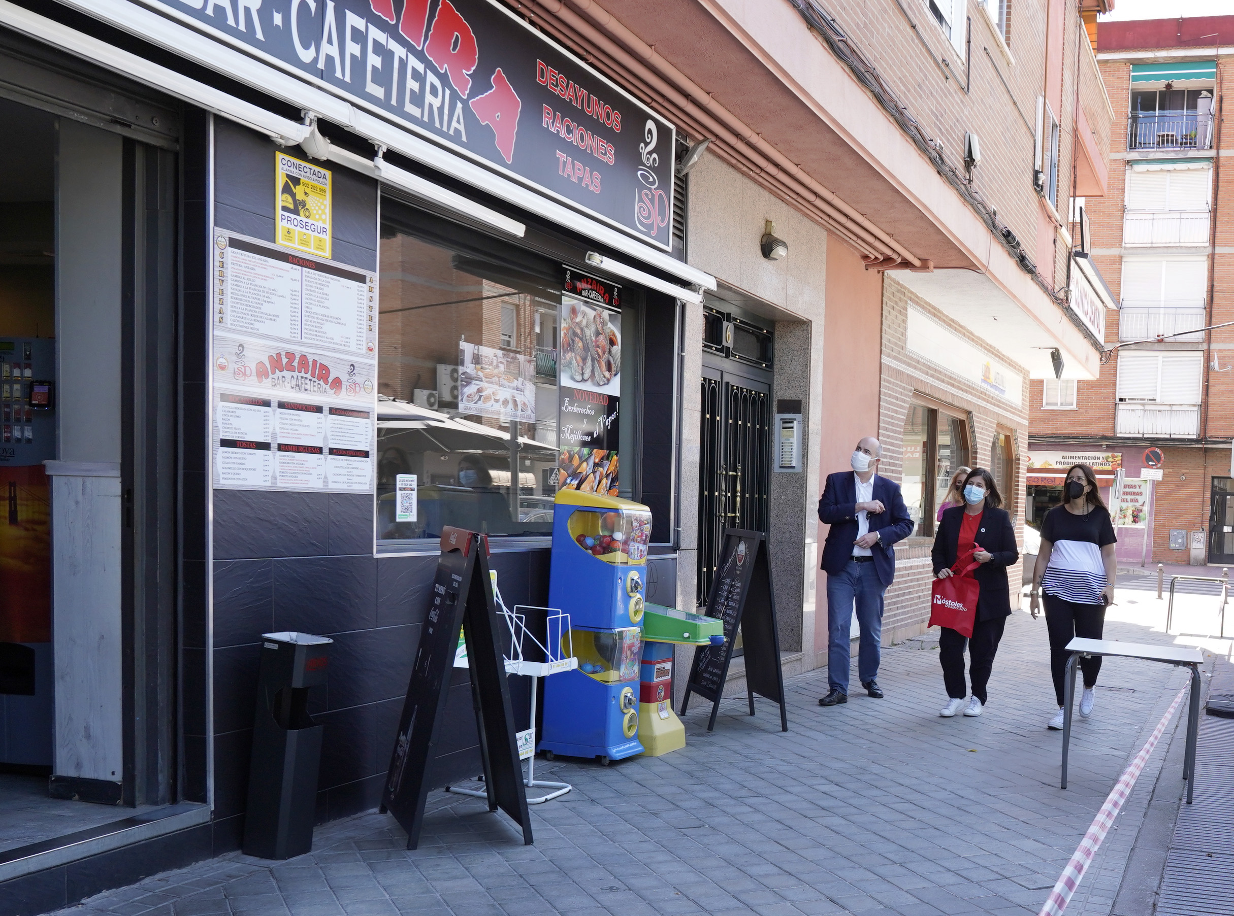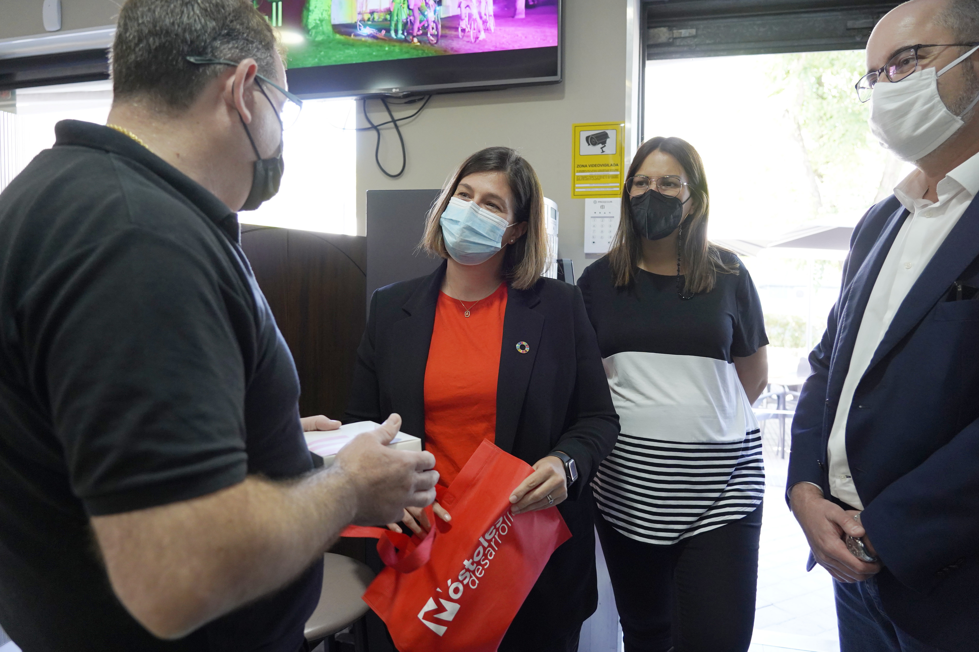 Imagen en alta resolución. Este enlace se abrirá mediante lightbox, puede haber un cambio de contextoLa Alcaldesa de Móstoles, Noelia Posse, acompañada de la Concejala de Empleo y Nuevas Tecnologías, Rebeca Prieto y el Presidente de la Junta de Distrito 1, Aitor Perlines, ha hecho entrega esta mañana de los primeros test de antígenos subvencionados por el Gobierno Local en el marco de la campaña de reactivación económica por la pandemia. Los ha entregado a los trabajadores de la cafetería Anzaira.