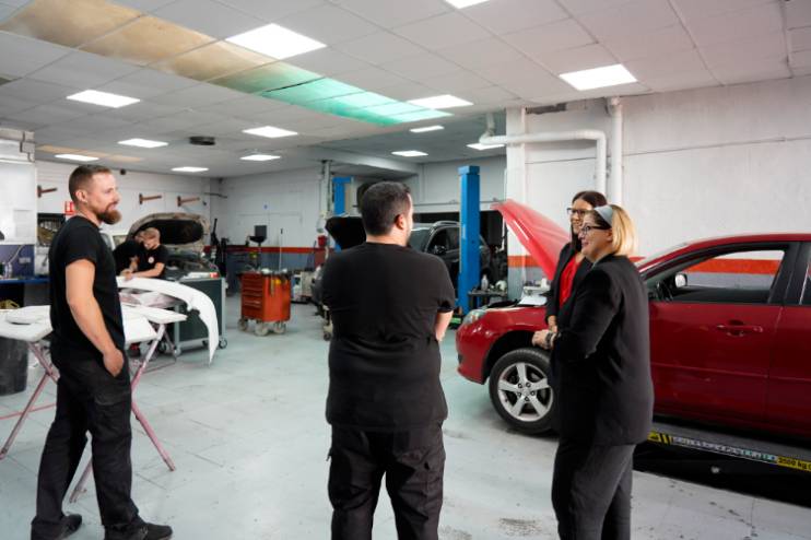 La Alcaldesa de Móstoles, Noelia Posse, acompañada de la Concejala de Empleo y Nuevas Tecnologías, Rebeca Prieto, ha visitado esta mañana el taller de mecánica y carrocería Palafox, que está situado en la calle Reyes Católicos, 29. La ha recibido Jorge Cerro, uno de sus tres socios.