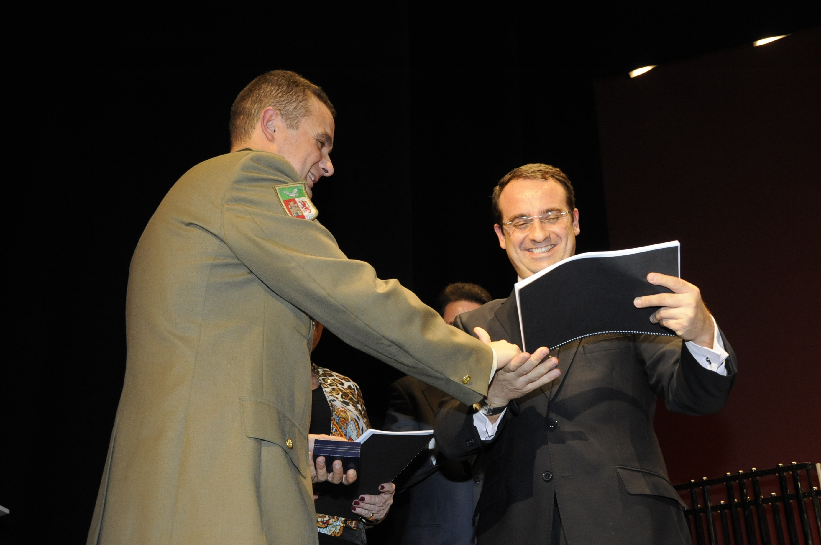 El Comandante músico Fernando Lizana, al frente de la Unidad de Música de la Dirección de Acuartelamiento del Ejército desde el año 2009, ha sido el encargado de entregar al regidor este recuerdo al concierto conmemorativo, con el que se deleitaron más de 600 personas que acudieron al teatro para recordar esta efeméride.
