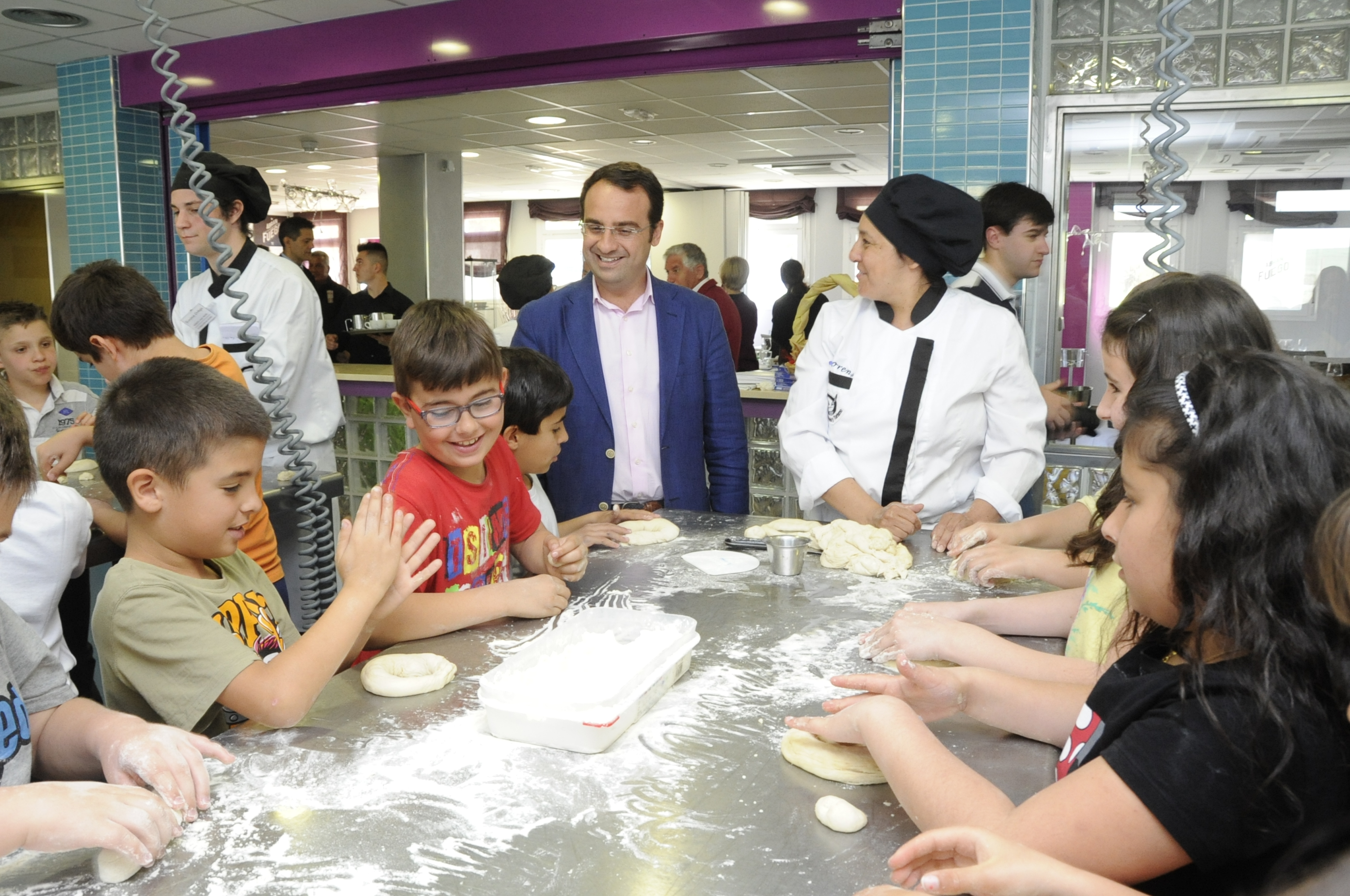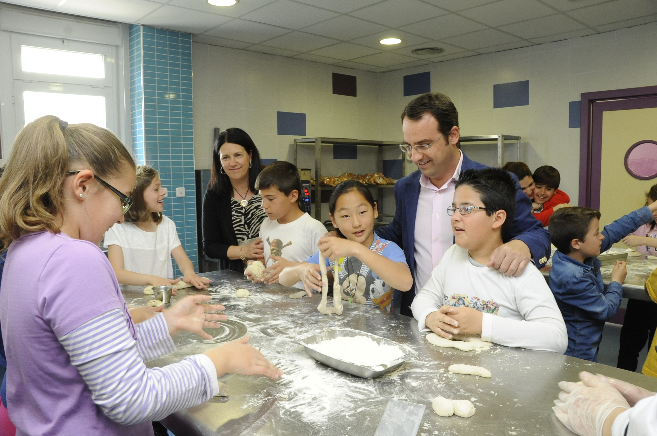 El Alcalde de Móstoles, Daniel Ortiz, ha visitado esta mañana la Escuela de Hostelería y Turismo Simone Ortega donde un grupo de alumnos de Educación Primaria del colegio Público Antusana ha participado en el taller de repostería para la elaboración y difusión de la "Rosca de San Marcos", iniciativa impulsada por la Federación de Peñas