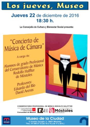 Imagen en alta resolución. Este enlace se abrirá mediante lightbox, puede haber un cambio de contextoLa Concejalía de Cultura y Bienestar Social, presenta en el Museo de la Ciudad el próximo jueves 22 de diciembre, a las 18:30, el concierto de Música de Cámara interpretado por alumnos de grado medio, del Conservatorio de Música "Rodolfo Halffter", dirigidos por los profesores Eduardo del Río y David Arenas, donde interpretarán obras de Rossini, Haydn, Schumann, Dvorak, Handel…
