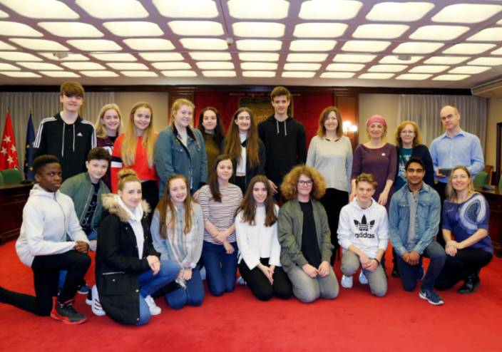 Imagen en alta resolución. Este enlace se abrirá mediante lightbox, puede haber un cambio de contextoEl pasado viernes visitaron el Ayuntamiento de Móstoles 21 alumnos y 2 profesores del `Sharnbrook Upper School´ de la localidad de Bedford (Inglaterra), dentro de un programa de intercambio en el que están participando junto a alumnos y profesores del IES Manuela Malasaña. En la Casa Consistorial fueron recibidos por la concejala de Educación, Isabel Cruceta. Se trata de un programa de aprendizaje de idiomas, así como de inmersión de los alumnos de 3º, 4ª ESO y 1º Bachiller en la cultura y costumbres de otro país. El intercambio se lleva realizando desde hace 14 años, por lo que ya cuenta con una gran tradición entre los alumnos y sus familias. Durante su estancia en Móstoles los alumnos ingleses han realizado diferentes actividades con sus homólogos españoles y han visitado Ávila, Toledo, la Casa Museo de Andrés torrejón y el Museo de la Ciudad. Los alumnos mostoleños visitarán a sus compañeros de Bedford del 29 de marzo al 5 de abril.