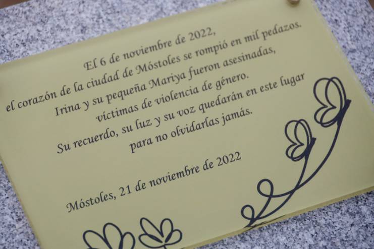 La Alcaldesa, Noelia Posse, acompañada de amigas y amigos de Irina y de la pequeña Mariya, el Presidente del Senado, Ander Gil, el Rector de la Universidad Rey Juan Carlos, Javier Ramos, otras autoridades y vecinos, ha descubierto además una placa en su memoria con la inscripción "El 6 de noviembre de 2022 el corazón de la ciudad de Móstoles se rompió en 1.000 pedazos. Irina y su pequeña Mariya fueron asesinadas víctimas de violencia de género. Su recuerdo, su luz y su voz quedarán en este lugar para no olvidarlas jamás".