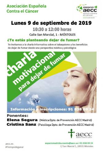 CURSO TABACO PrincipalImagen en alta resolución. Este enlace se abrirá mediante lightbox, puede haber un cambio de contextoCURSO TABACO PrincipalLa AECC en Móstoles organizará el próximo mes de octubre un tratamiento médico y psicológico dirigido a aquellas personas que quieran dejar de fumar. El curso se impartirá en el Espacio Activo Suroeste (calle San Marcial, 1). Las plazas son limitadas y el periodo de inscripciones permanecerá abierto hasta el 12 de septiembre, inclusive, en el teléfono 91 838 09 24 y en espaciomadridsuroeste@aecc.esEste enlace se abrirá en una ventana nueva.