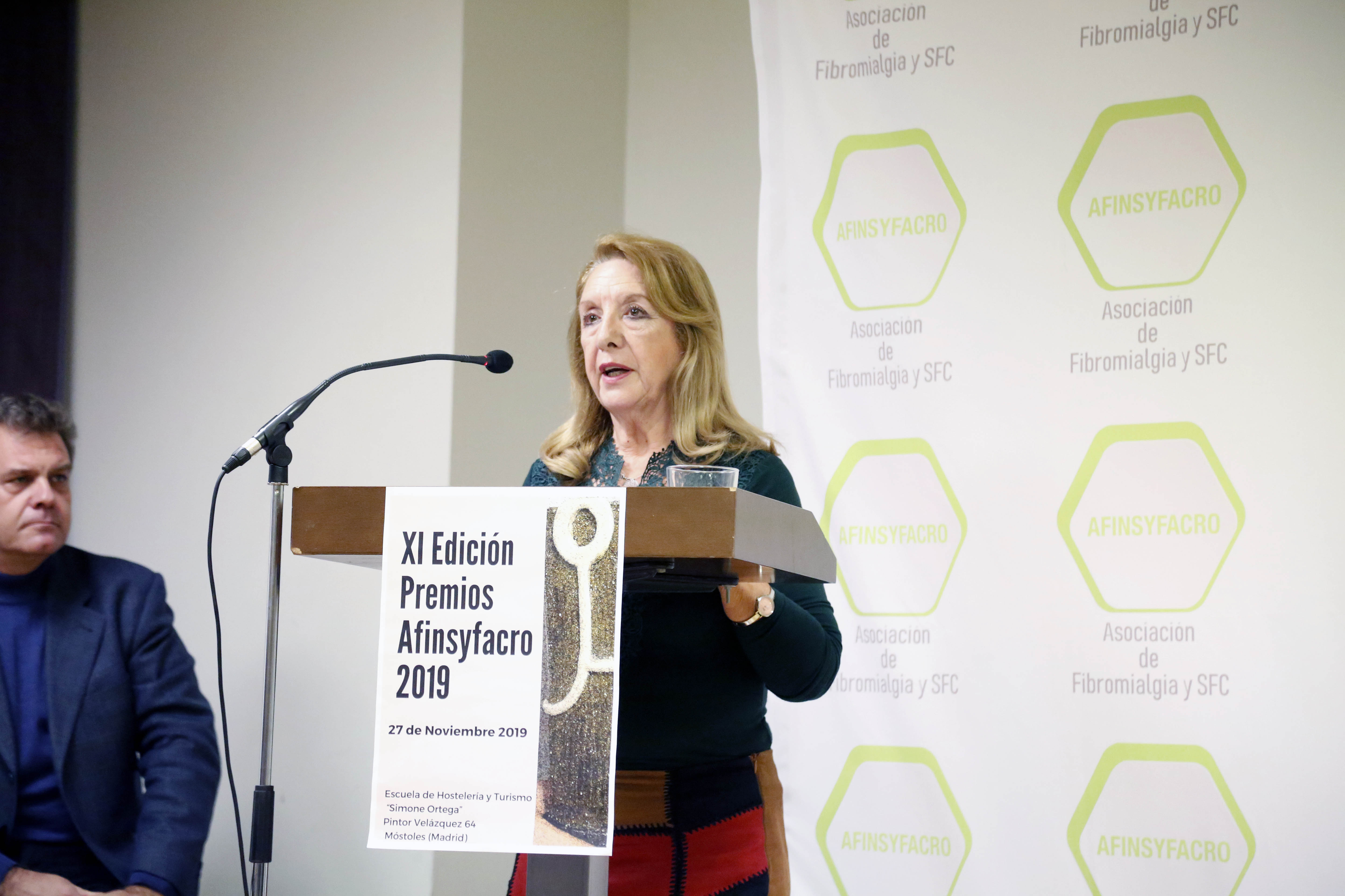 Imagen en alta resolución. Este enlace se abrirá mediante lightbox, puede haber un cambio de contextoLa Asociación de Fibromialgia y Síndrome de Fatiga Crónica (Afinsyfacro) celebró ayer su XI edición de Premios, en la Escuela de Hostelería y Turismo ‘Simone Ortega’ del municipio. La gala contó con la presencia de la concejala de Derechos Sociales y Mayores, María Dolores Triviño, el concejal de Seguridad, Convivencia, Cultura y Transición Ecológica, Alejandro Martín, la concejala de Educación y Juventud, Natividad Gómez, así como de responsables sanitarios del ámbito universitario y de la Comunidad de Madrid.
