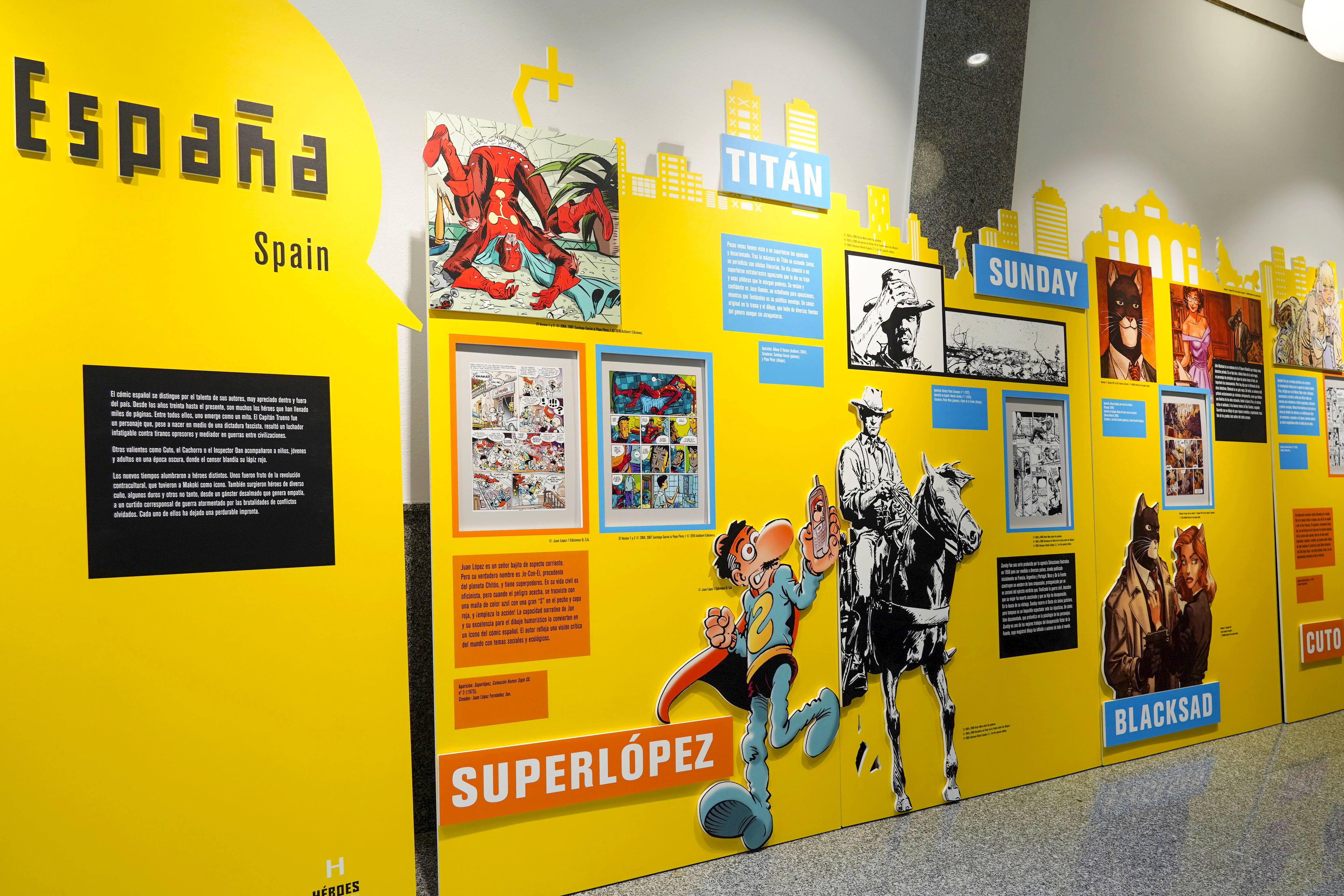 La muestra consta de 43 paneles expositivos con cada uno de los personajes. Todos los héroes del cómic de la exposición han sido publicados en España. En la actualidad la industria del cómic en nuestro país goza de buena salud, tanto a nivel productor, exportador e importador de historietas y tebeos de toda Europa.
