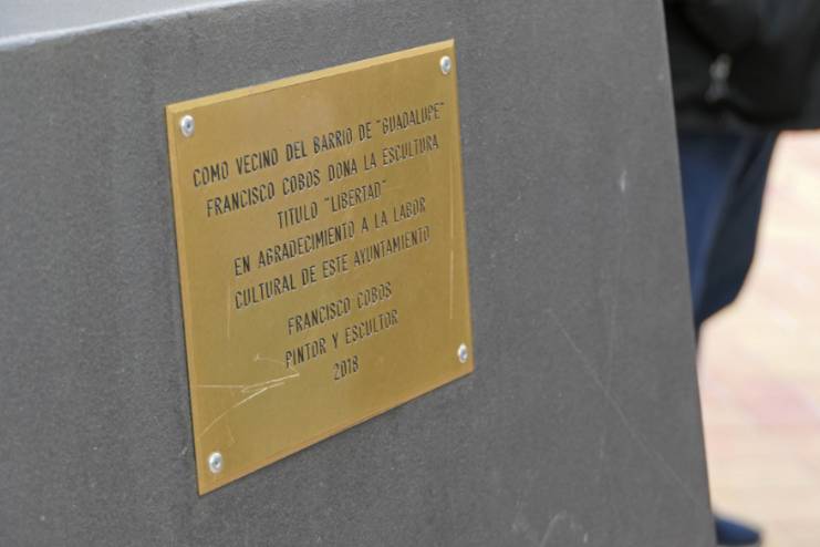 Homenaje Paco Cobos 1Imagen en alta resolución. Este enlace se abrirá mediante lightbox, puede haber un cambio de contextoHomenaje Paco Cobos 1En agradecimiento a la escultura que lleva por nombre "Libertad", donada al municipio por el escultor y pintor mostoleño, residente en el barrio Guadalupe, Francisco Cobos, el Ayuntamiento ha hecho entrega de una placa de reconocimiento a la labor y trayectoria del artista. En el acto estuvieron presentes, junto a Cobos y vecinos de la zona, el concejal de Cultura, Bienestar Social y Vivienda, Gabriel Ortega, y la concejala de Urbanismo y Patrimonio, Beatriz Benavides.