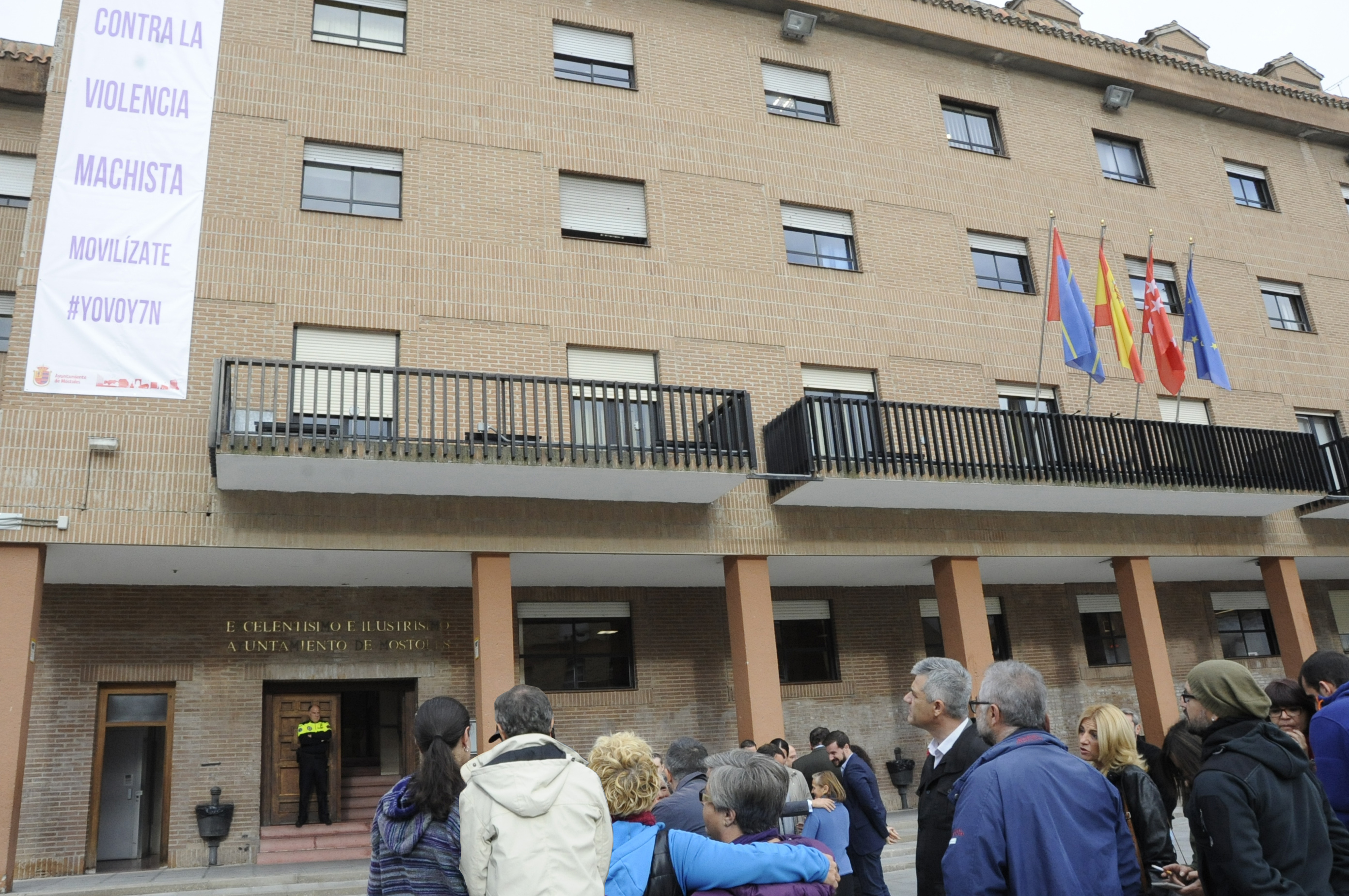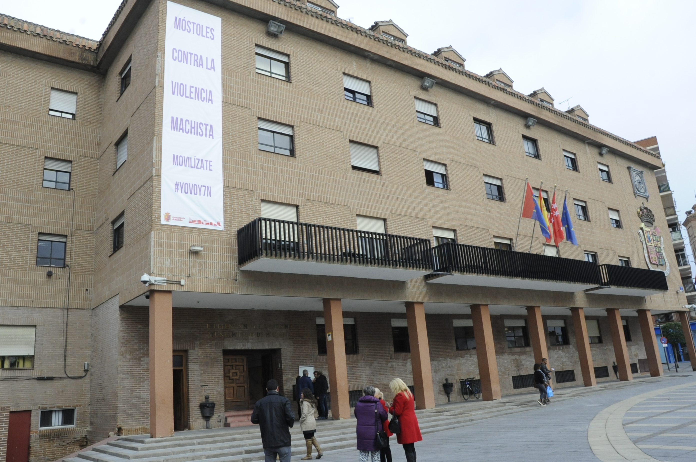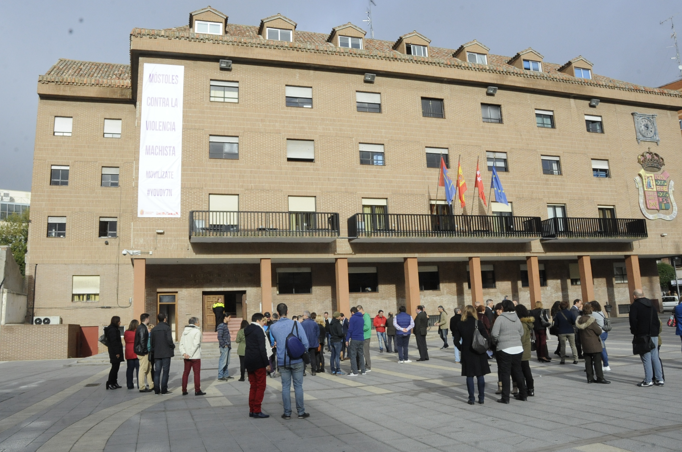 Una pancarta con el lema "Móstoles contra la Violencia Machista. Movilízate # YO VOY 7 N" ha sido desplegada esta mañana en la fachada del Ayuntamiento de Móstoles, con la que el Consistorio mostoleño, además de visibilizar ante la población su compromiso de lucha contra la lacra social que supone la violencia de género, también ha invitado a todos los mostoleños y mostoleñas a que participen en la manifestación del 7 de noviembre convocada por la Plataforma Feminista de España. En el acto han participado los grupos municipales con representación en el Ayuntamiento de Móstoles (PSOE, IUCM-LV, Ganar Móstoles y PP), asociaciones de mujeres y otros colectivos ciudadanos.
