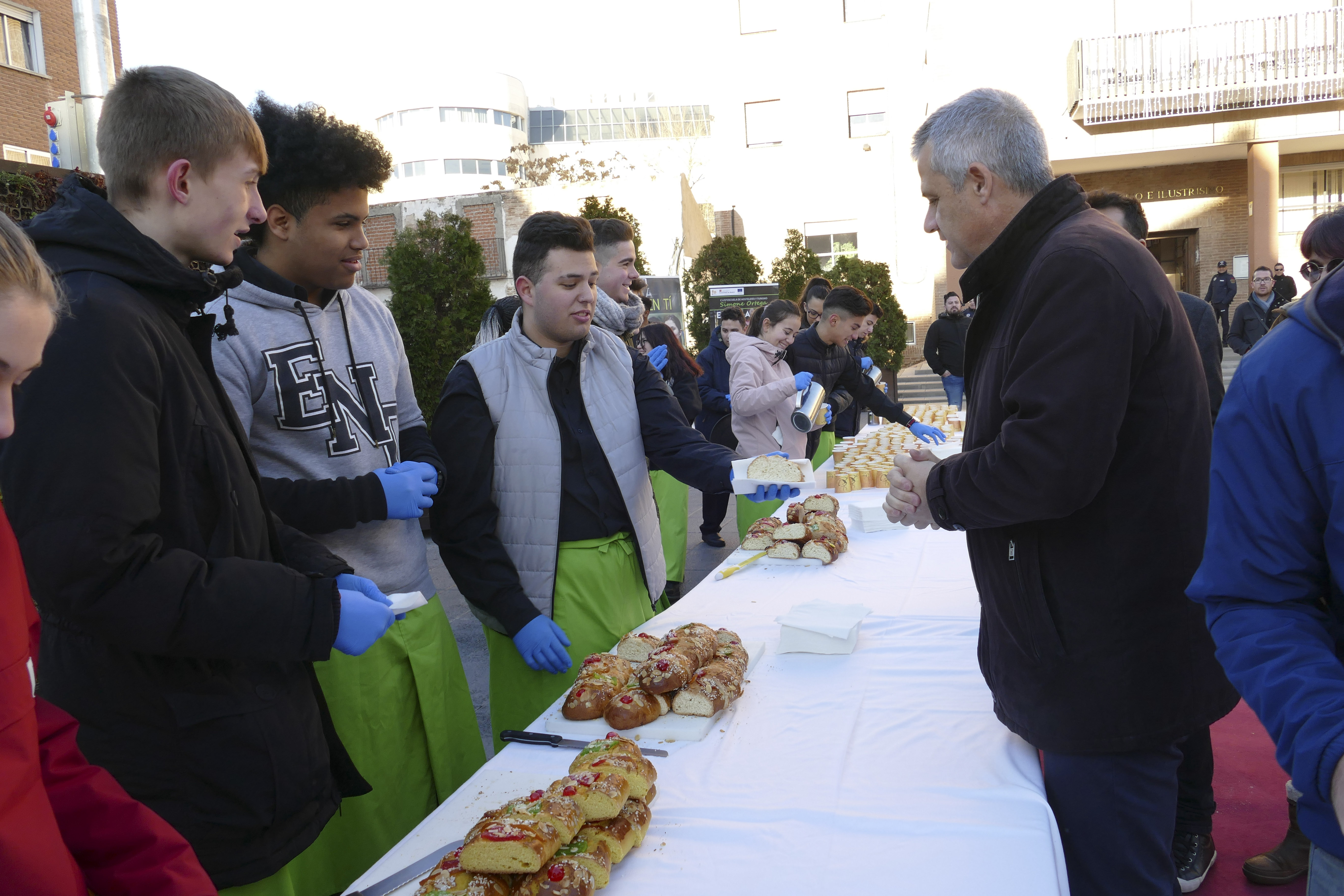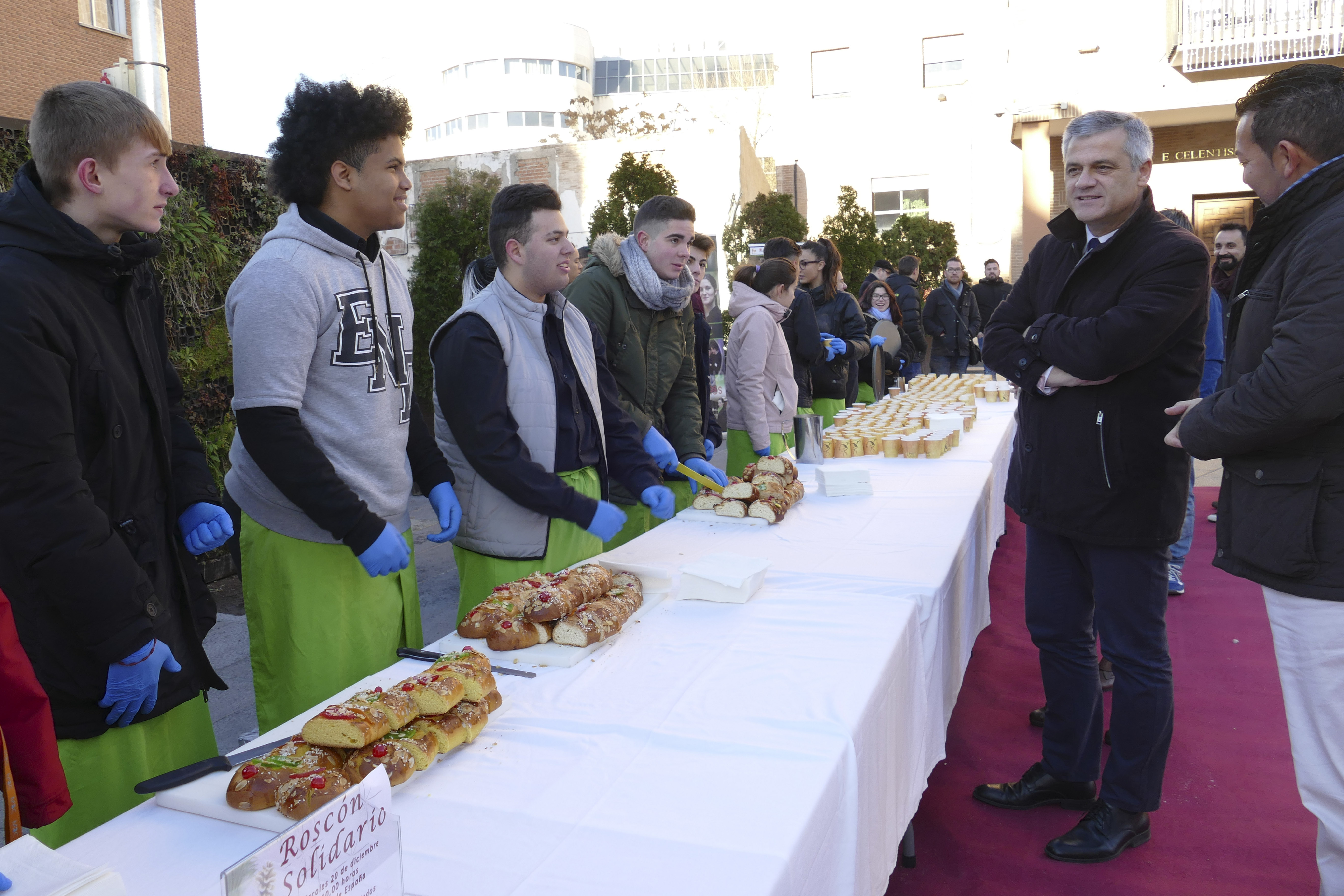Imagen en alta resolución. Este enlace se abrirá mediante lightbox, puede haber un cambio de contextoEl Alcalde de Móstoles, David Lucas, ha asistido a la degustación del roscón solidario que el Ayuntamiento ha organizado esta mañana elaborado por la Escuela de Hostelería y Turismo `Simone Ortega´, que ha contado con la asistencia de numerosos vecinos y vecinas que han querido participar en la iniciativa. El roscón ha sido elaborado por los alumnos y alumnas de Grado Medio del Ciclo de Pastelería, Panadería y Confitería de la Escuela de Hostelería. Los alumnos de FP Básica se han encargado del servicio durante el acto.