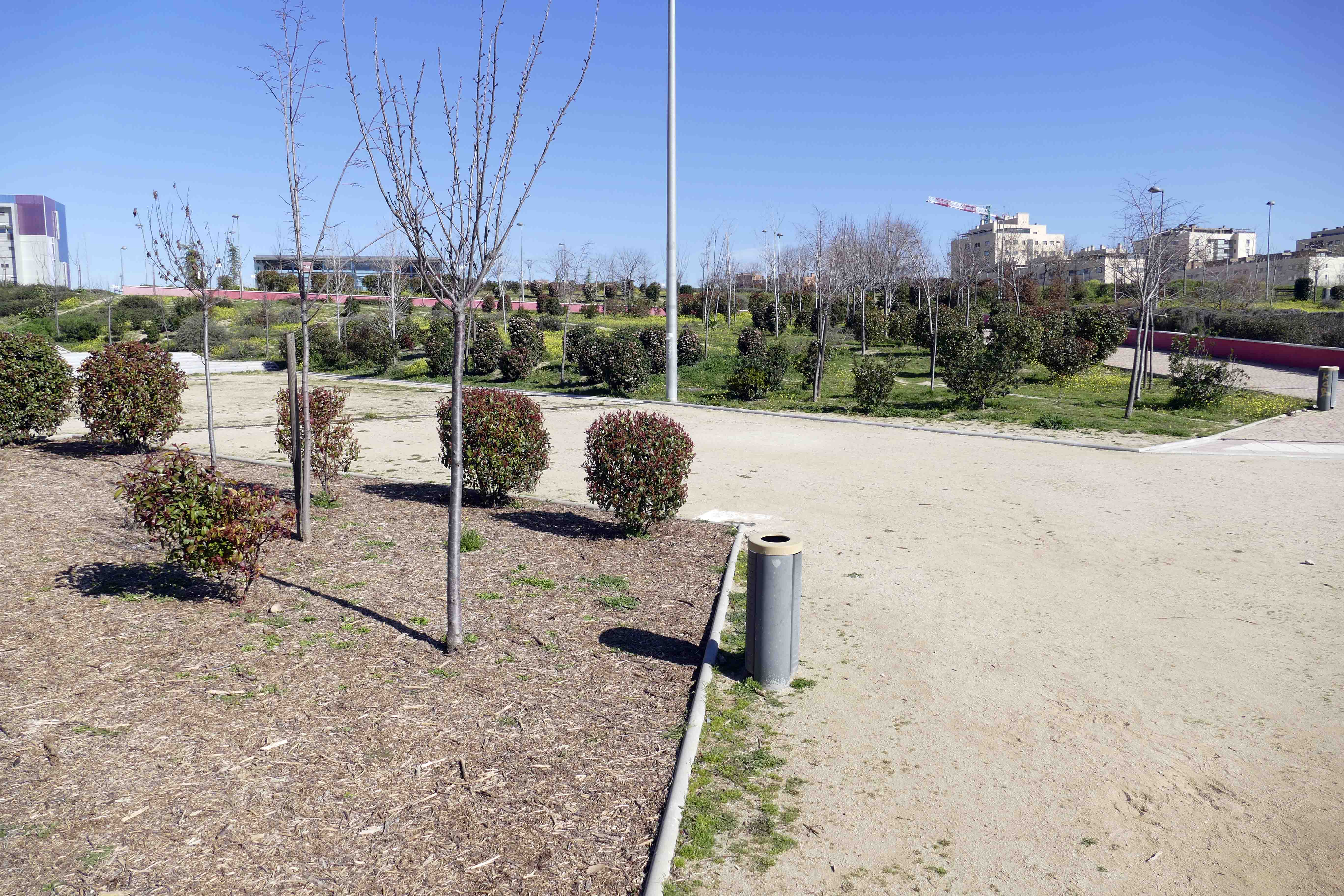 En esta zona del PAU4 se han empezado a comprobar las zonas verdes y a supervisar el estado de los parques, jardines y áreas de juego públicas. Se han revisado los parterres, los alcorques, se han revisado los sistemas de riego, se ha procedido al desbroce y tala, y de modo experimental se están reutilizando los restos triturados para evitar el crecimiento de hierbas malas.
