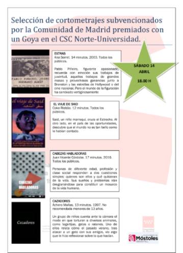 Imagen en alta resolución. Este enlace se abrirá mediante lightbox, puede haber un cambio de contextoEl Centro Sociocultural Norte-Universidad proyectará el día 14 de abril, a las 18 horas, una selección de cortometrajes subvencionados por la Comunidad de Madrid y premiados con un Goya.