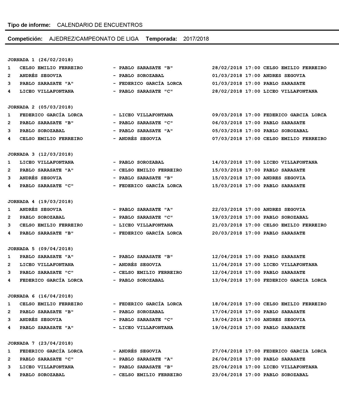 El calendario de la liga municipal de ajedrez con los colegios inscritos y las fechas de realización son las siguientes:
