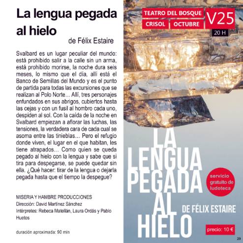 Imagen en alta resolución. Este enlace se abrirá mediante lightbox, puede haber un cambio de contextoLa programación de "A Escena Móstoles" continúa este fin de semana con la representación el viernes 25 de octubre de "La lengua pegada al hielo" a las 20 horas en el Teatro del Bosque.