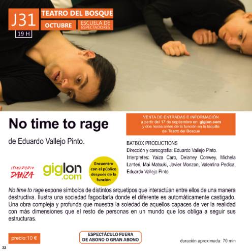 El jueves 31 de octubre, la Escuela de Espectadores presenta el espectáculo de danza contemporánea "No time to rage" en el Teatro del Bosque a las 19 horas.
