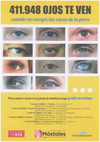 Imagen en alta resolución. Este enlace se abrirá mediante lightbox, puede haber un cambio de contexto"411.948 ojos te ven cuando no recoges las cacas de tu perro" es el lema de la nueva campaña de concienciación para el cuidado y limpieza de la ciudad, puesta en marcha por la concejalía de Medio Ambiente, Servicios Generales y Festejos. El objetivo de la iniciativa es que todas aquellas personas que tengan un perro, lo censen en su correspondiente Junta de Distrito y recojan, de manera gratuita, las bolsas para mantener impolutas las calles y espacios públicos de Móstoles.