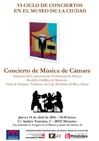Imagen en alta resolución. Este enlace se abrirá mediante lightbox, puede haber un cambio de contextoLa concejalía de Cultura y Deportes, presenta el jueves 14 de abril a las 18:30, en el Museo de la Ciudad, el Concierto de Música de Cámara interpretado por alumnos del Conservatorio Rodolfo Halffter de Móstoles, a cargo de los profesores David Arenas y Eduardo del Río.