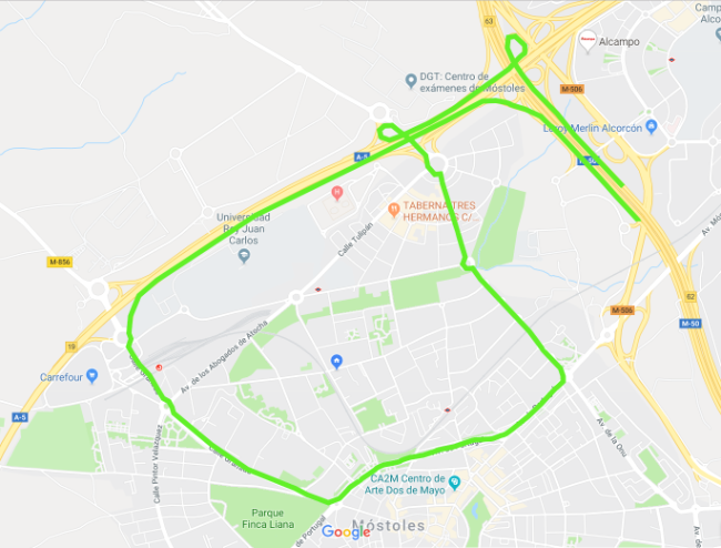 Sentido Móstoles: Calle Margaritas, Av. Alcalde de Móstoles, Pintor Velázquez.