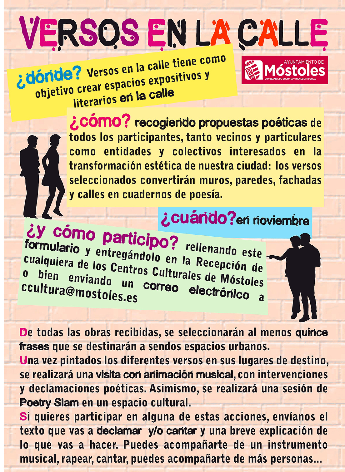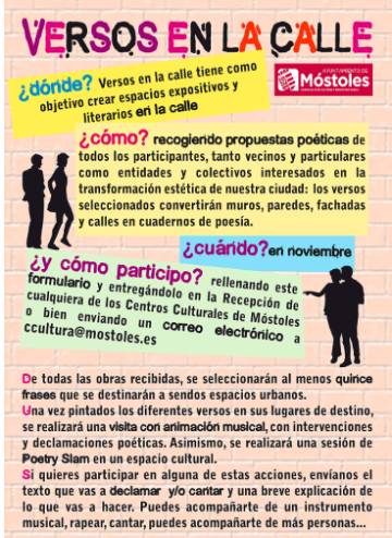 Imagen en alta resolución. Este enlace se abrirá mediante lightbox, puede haber un cambio de contextoLa concejalía de Cultura y Bienestar Social pone en marcha el proyecto "Versos en la calles", una iniciativa `poética´ que se desarrollará durante los meses de noviembre y diciembre con el objetivo de crear espacios expositivos y literarios en las calles Móstoles.
