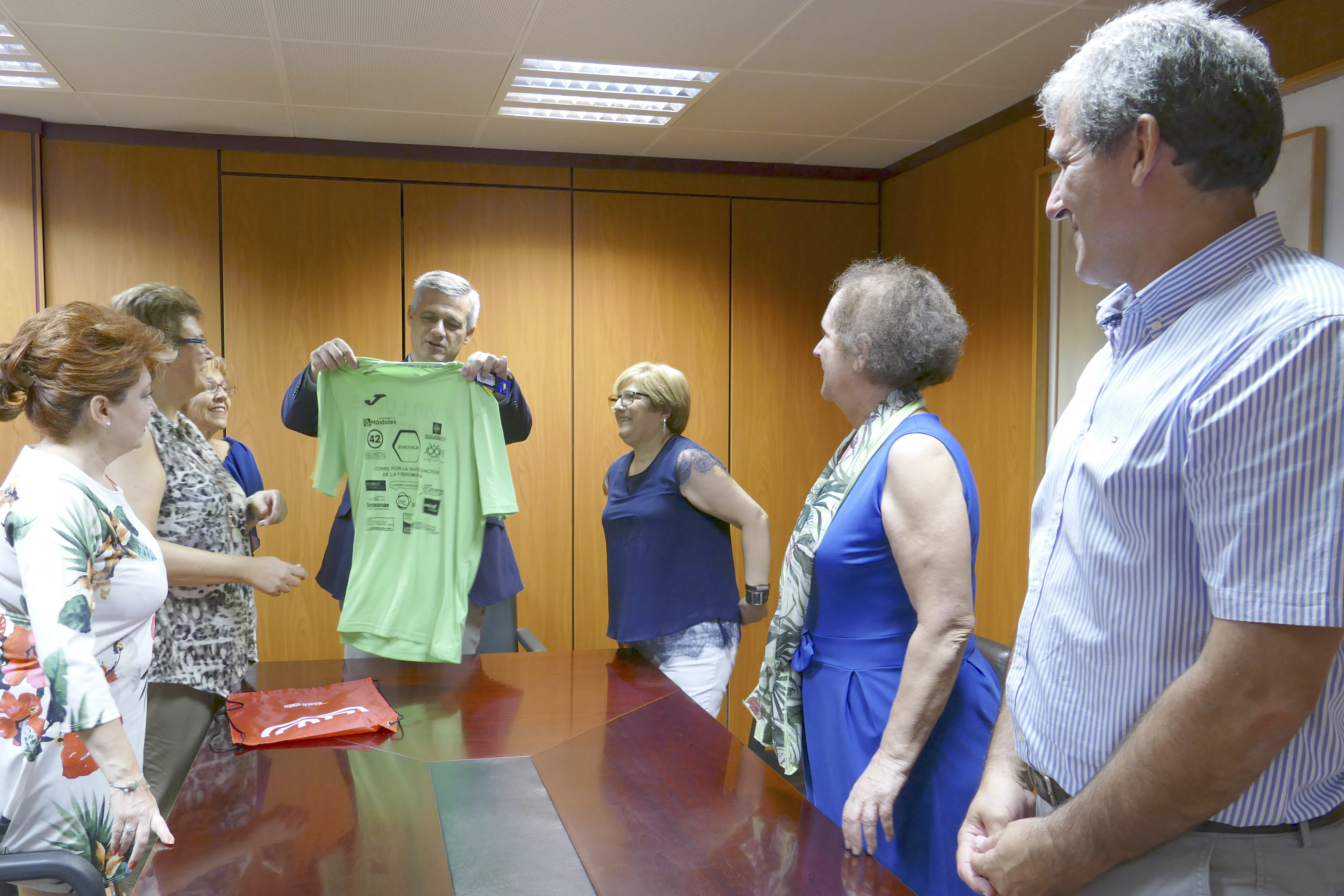 Entrega Camiseta carrera AFINSYFACRO 1 (Copiar)Imagen en alta resolución. Este enlace se abrirá mediante lightbox, puede haber un cambio de contextoEntrega Camiseta carrera AFINSYFACRO 1 (Copiar)Esta mañana, el alcalde de Móstoles, David Lucas, acompañado por la concejala de Igualdad, Sanidad y Mayores, Ana María Rodrigo, el concejal de Deportes, Agustín Martín, y el concejal de Presidencia, Seguridad Ciudadana y Movilidad, Roberto Sánchez, han recibido las camisetas de la VI Carrera por la investigación de la Fibromialgia y el Síndrome de fatiga crónica que organiza la Asociación Afinsyfacro. La presidenta de Afinsyfacro, Paula Jiménez, ha sido la encargada de hacer la entrega, quien ha acudido acompañada por otras representantes de la Asociación.