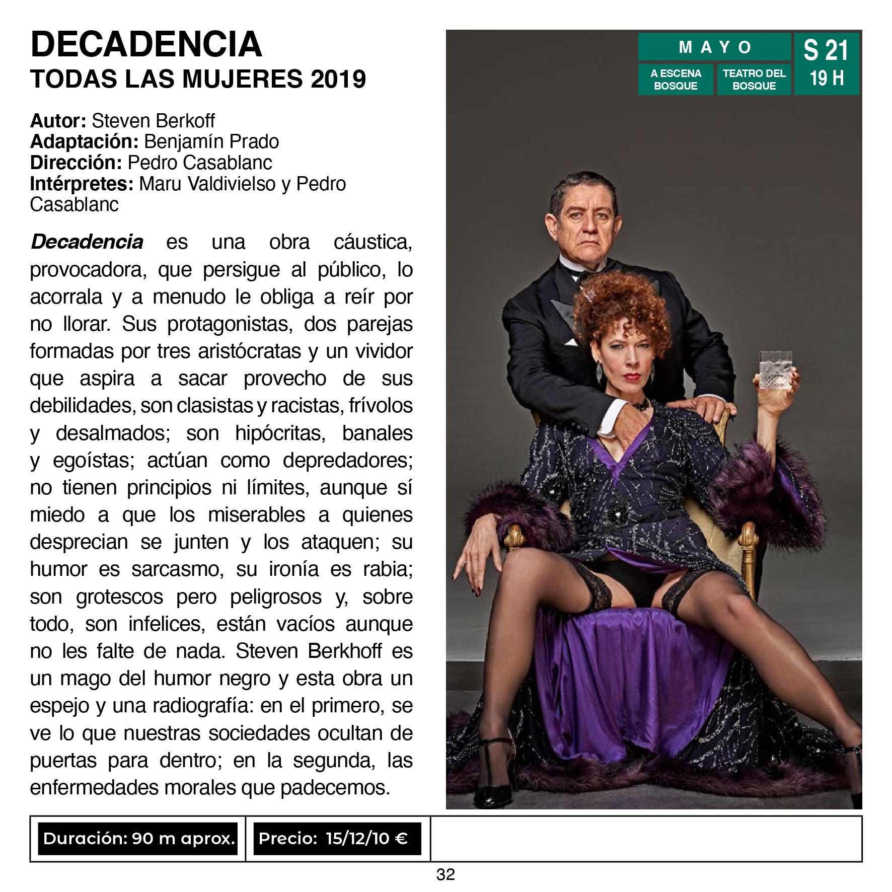 El sábado 21, a las 19:00 h., el Teatro del Bosque presenta "Decadencia. Todas las mujeres 2019". Dirigida por Pedro Casablanc, "Decadencia" es una obra cáustica, provocadora, que persigue al público, lo acorrala y a menudo le obliga a reír por no llorar. Sus protagonistas, dos parejas formadas por tres aristócratas y un vividor que aspira a sacar provecho de sus debilidades… Steven Berkhoff es un mago del humor negro y esta obra un espejo y una radiografía: en el primero, se ve lo que nuestras sociedades ocultan de puertas para dentro; en la segunda, las enfermedades morales que padecemos.