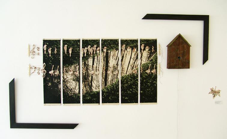 Imagen en alta resolución. Este enlace se abrirá mediante lightbox, puede haber un cambio de contextoMaria Verdugo Althöfer con la colaboración de Raúl Verdugo Althöfer (música) - "Du immer..." Técnica: Litografía e intervención manual. La música modifica las percepciones. Una imagen puede sugerir diversas propuestas en un espectador, pero si ésta se visualiza escuchando una música, las emociones generadas son otras diferentes. De igual modo, una imagen puede condicionar una música. El entorno visual influye en ella. Si uno cierra los ojos y escucha una melodía sin una imagen que interfiera, las emociones percibidas serán distintas. En este caso concreto, la obra en su conjunto "imagen" y "melodía" nos plantea ciertas cuestiones: ¿están los pájaros escribiendo la melodía que escuchamos? ¿la música del interior de los pájaros nos dicta la melodía que oímos?... Sólo los que conozcan el lenguaje musical se darán cuenta que lo que pareciera evidente no lo es, los pájaros /notas componen una melodía totalmente distinta a la que se escucha y a la que aparece escrita en su interior. Porque realmente hay que ir más allá de lo que parece a primera vista. La imagen es un reflejo, y es ese reflejo el que nos suministra la información verdadera de donde nos encontramos, nos sitúa en un entorno concreto y la música quiere llevarte, ayudarte a moverte hacia un camino concreto de sensaciones (aunque puede que nunca sea el mismo que el que le llevó al compositor y al artista a crear esa obra).