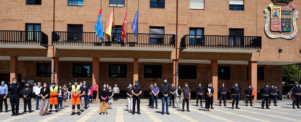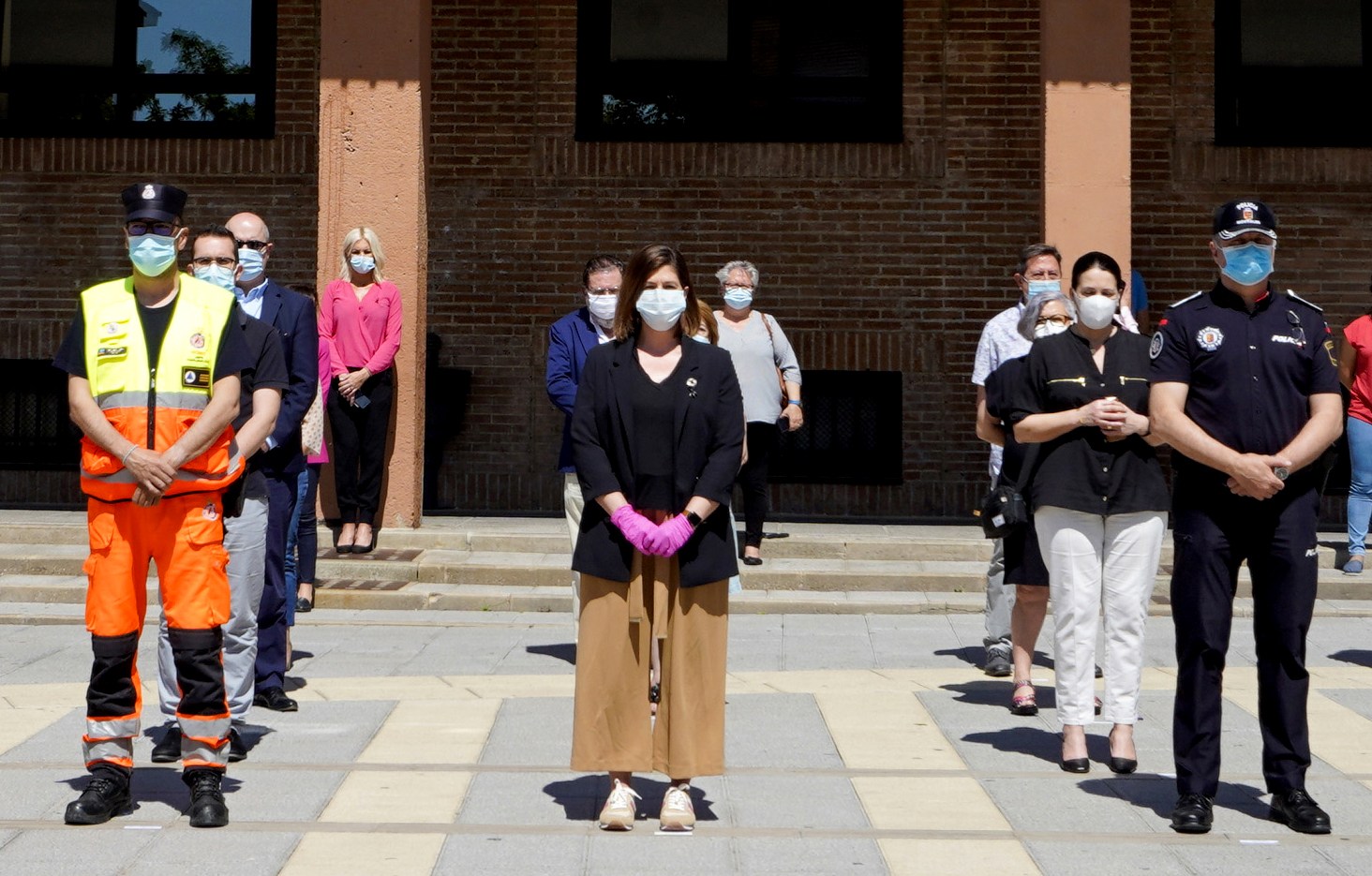 Las Autoridades, acompañadas de representantes de Policía Municipal, Bomberos, Protección Civil y de otros trabajadores de servicios públicos esenciales y vecinos de la ciudad, han guardado un minuto de silencio en honor a todos los fallecidos por el coronavirus.
