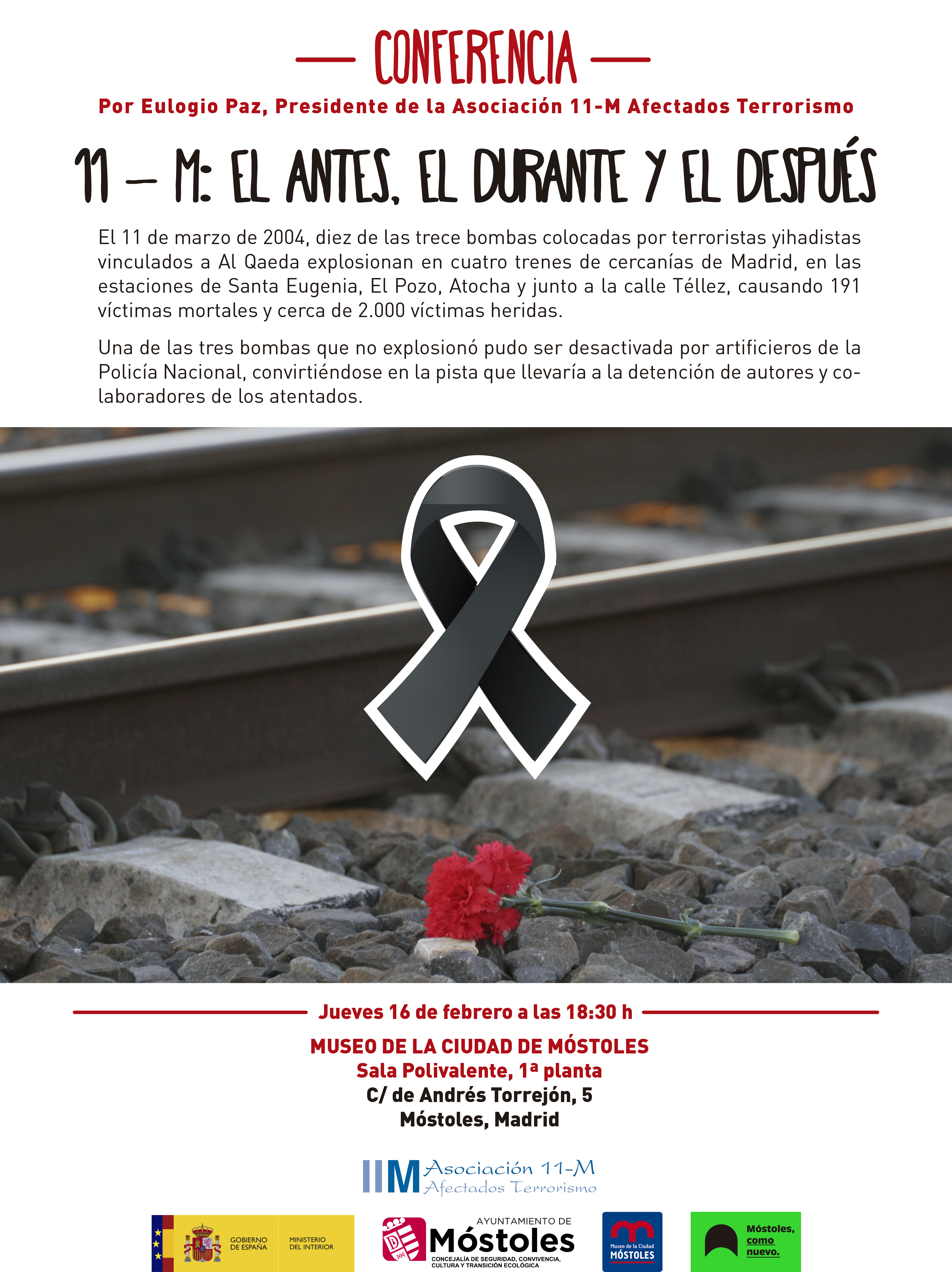 El jueves 16, el Presidente de la Asociación 11-M Afectados Terrorismo, Eulogio Paz, ofrecerá la conferencia "11-M: El antes, el durante y el después" a las 18:30 h en el Museo de la Ciudad. La entrada es gratuita y las invitaciones podrán recogerse en el Museo de la Ciudad desde el martes 14 de 10:00 h a 14:00 h y de 17:00 h a 20:00 h.