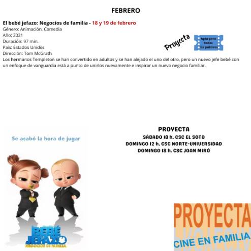 Dentro del programa "Proyecta. Cine en familia" se proyectará el fin de semana la película "El bebé jefazo: Negocios de familia" para los más pequeños. Será el sábado 18 a las 18:00 h en el Centro Sociocultural El Soto, y el domingo 19, a las 12:00 h en el Centro Norte Universidad y a las 18:00 h en el Centro Sociocultural Joan Miró.