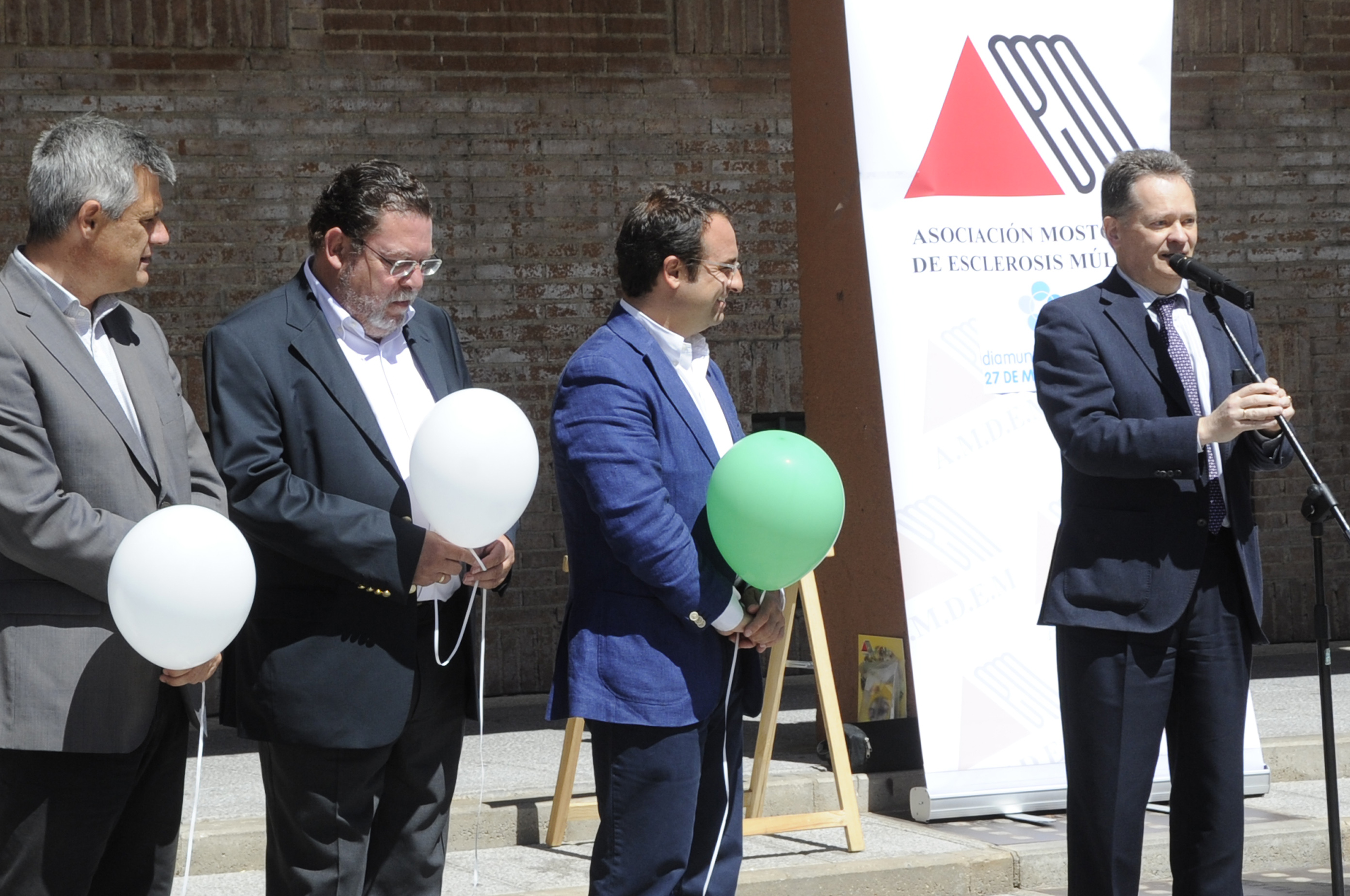 La Asociación Mostoleña de Esclerosis Múltiple -AMDEM- realizó esta mañana, en la Plaza España, frente al Ayuntamiento, una "suelta de globos y cordón humano", con motivo del Día Mundial de la Esclerosis Múltiple.