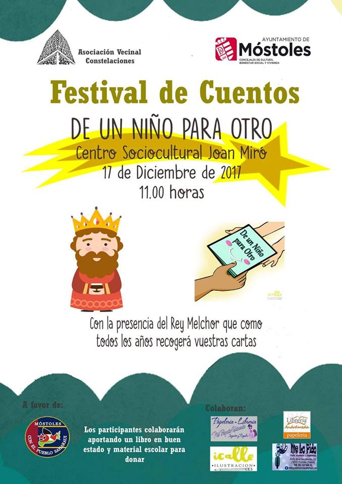 Imagen en alta resolución. Este enlace se abrirá mediante lightbox, puede haber un cambio de contextoLa Asociación Vecinal Constelaciones organizó ayer, en colaboración con el Ayuntamiento, un Festival de Cuentos solidario "De un niño para otro", en el Centro Sociocultural Joan Miró, donde los participantes pudieron colaborar mediante la aportación de libros y diverso material escolar destinados a los niños saharauis, a través de la Asociación Móstoles con el pueblo saharaui. El alcalde de Móstoles, David Lucas, asistió a esta celebración junto a la concejala de Educación, Isabel Cruceta, y la concejala de Obras, Infraestructuras, Mantenimiento de Vías Públicas y Festejos, Noelia Posse.