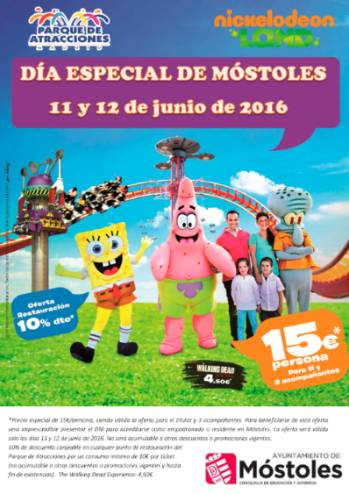 Imagen en alta resolución. Este enlace se abrirá mediante lightbox, puede haber un cambio de contextoUn año más el Ayuntamiento de Móstoles, a través de la concejalía de Juventud, ha conseguido un nuevo `Día Especial de Móstoles´ en el Parque de Atracciones de Madrid. De este modo los días 11 y 12 de junio los vecinos podrán beneficiarse de importantes descuentos con tan solo acreditar su residencia en la localidad.. La propuesta consiste en la obtención de un precio especial de 15 € por persona, pudiendo beneficiarse de dicho descuento el residente, así como 3 acompañantes. Además podrán obtener un 10% de descuento, canjeable en cualquier punto de restauración del Parque de Atracciones, por un consumo mínimo de 10€ por ticket (no acumulable a otras descuentos o promociones vigentes y hasta fin de existencias) y el The Walking Dead Experience a 4,50€