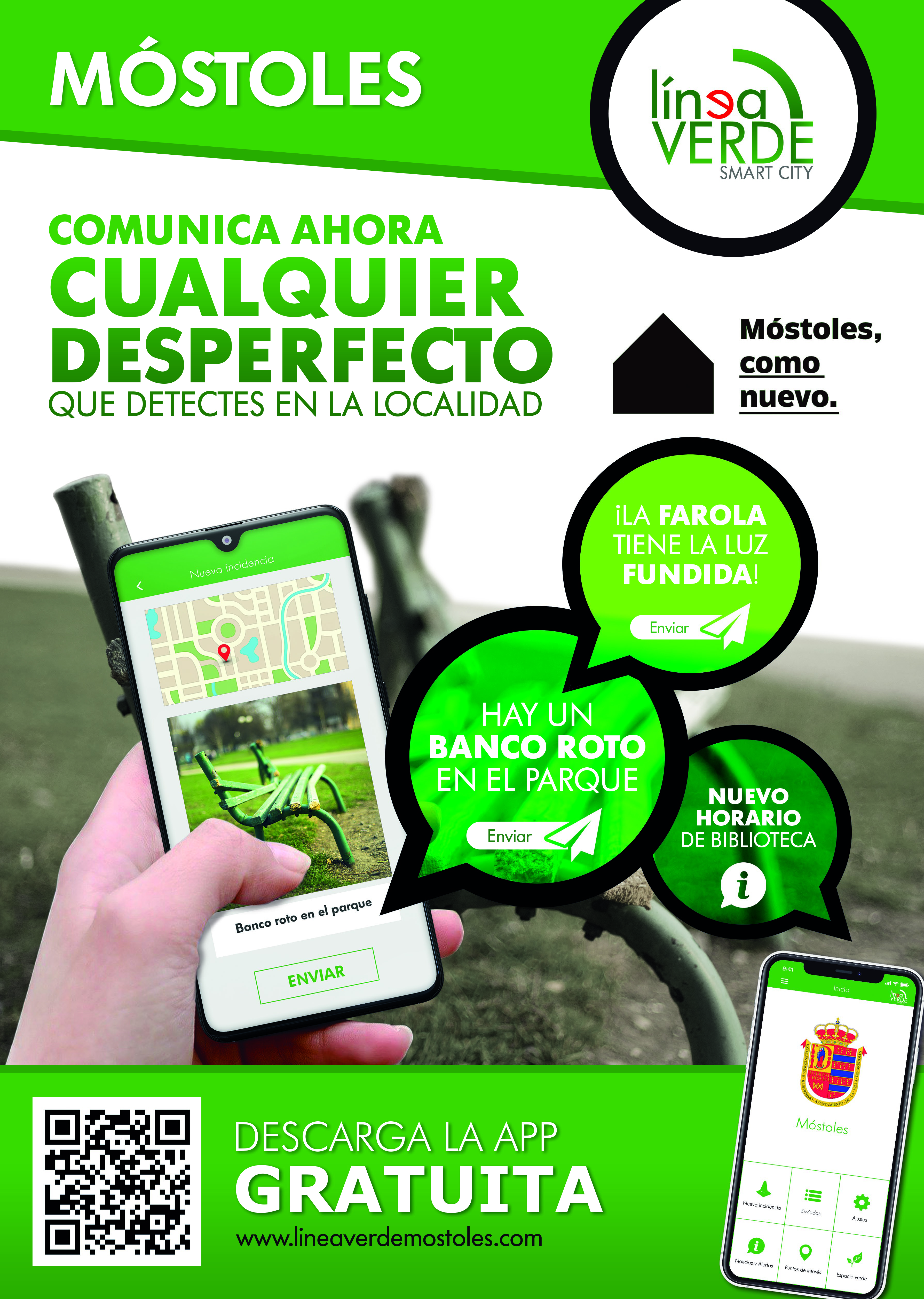 Mostoles Linea Verde AppMostoles Linea Verde AppPara reforzar la escucha activa y mejorar la comunicación directa con las mostoleñas y mostoleños, el Gobierno Local formado por PSOE y Podemos, ha ampliado la APP Línea Verde, una herramienta para que las vecinas y vecinos comuniquen de modo inmediato cualquier desperfecto que detecten en la ciudad, ya sea en las vías públicas, en parques, en cuestión de residuos urbanos, desperfectos en alumbrado, tráfico, movilidad… y al mismo tiempo permite que puedan recibir avisos de cualquier incidencia que las distintas áreas consideren de interés ciudadano.