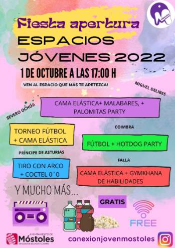 El programa "Espacio Joven" volverá a desarrollarse los sábados por la tarde en los cinco distritos del municipio en horario de 17:00 h a 20:00 h. Se desarrollarán actividades deportivas, formativas, talleres culturales… en el IES Manuel de Falla, CEIP Severo Ochoa, CEIP Príncipe de Asturias, CEIP Miguel Delibes y el IES Gabriel Cisneros.