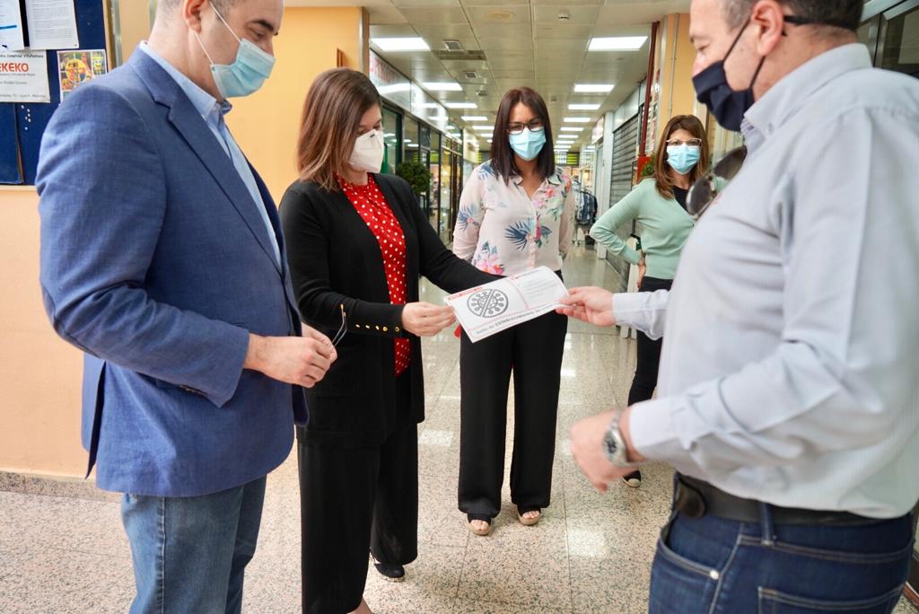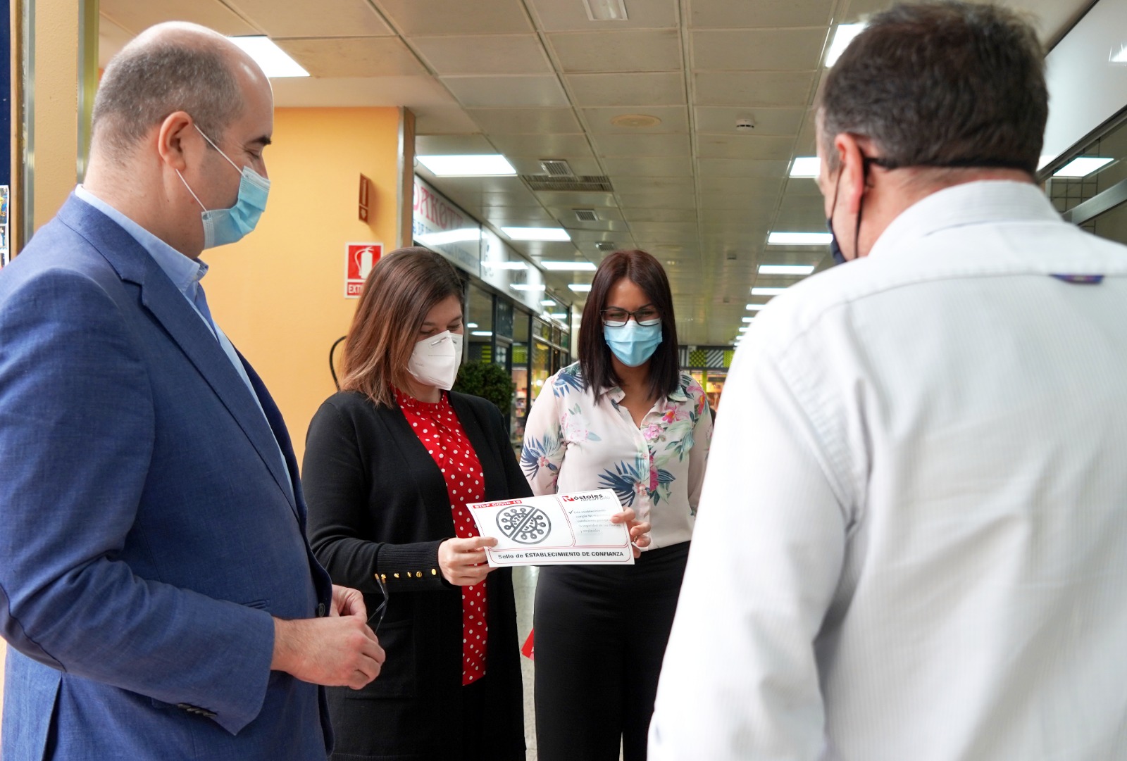 La Alcaldesa de Móstoles, Noelia Posse, acompañada de la Portavoz de Podemos y Presidenta de la Comisión Especial de Estudio y Dirección de la Estrategia de Salida de la crisis provocada por el coronavirus, Mónica Monterral, la Concejala de Presidencia y responsable del área de empleo, Rebeca Prieto, y el Concejal de Hacienda y Presidente del Distrito 3, Aitor Perlines, ha hecho entrega esta mañana del distintivo "Este comercio es de confianza" a los dos primeros establecimientos de la ciudad que lo reciben: Azulejos Dugal y el centro Kumon Móstoles.