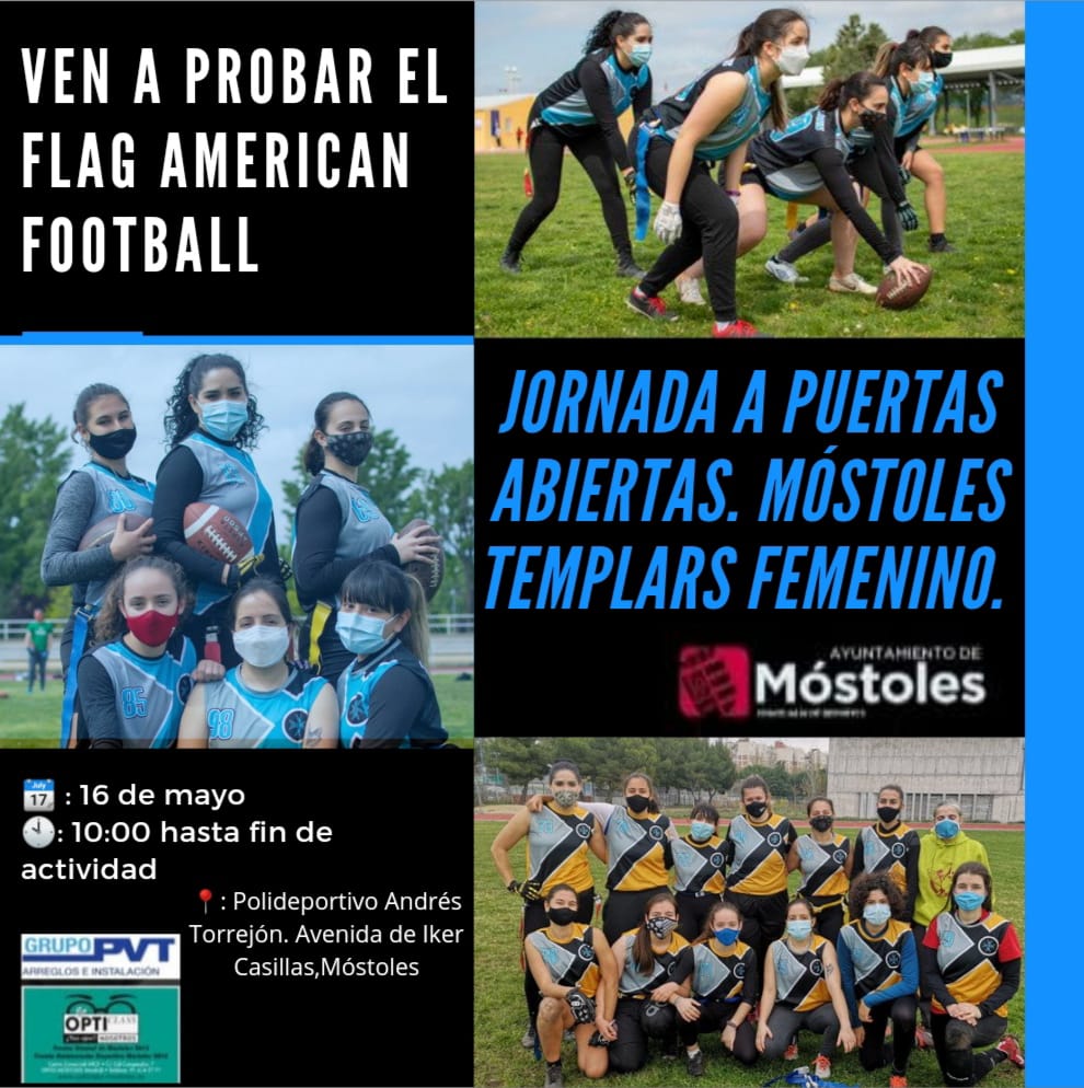 Jornada de puertas abiertas del Club Móstoles Templars FemeninoPImagen en alta resolución. Este enlace se abrirá mediante lightbox, puede haber un cambio de contextoJornada de puertas abiertas del Club Móstoles Templars FemeninoPEl Club Móstoles Templars Femenino ofrecerá, el próximo 16 de mayo, a partir de las 10:00 h en el Polideportivo Andrés Torrejón de la localidad, una jornada de puertas abiertas de Flag Football. El objetivo es el de promocionar y fomentar este deporte entre las mujeres de nuestro municipio, y ampliar la plantilla femenina.