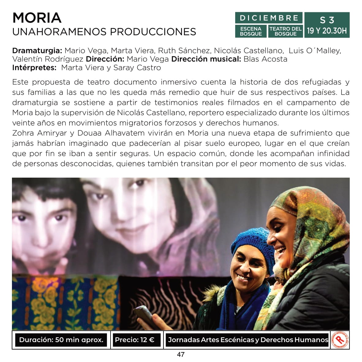 El sábado 3, en A Escena Bosque "Moria" de la compañía "Unahoramenos Producciones", en el Teatro del Bosque, a las 19 y 20.30 horas, se presentará una propuesta de teatro documento inmersivo, que cuenta la historia de dos refugiadas y sus familias a las que no les queda más remedio que huir de sus respectivos países. La dramaturgia se sostiene a partir de testimonios reales filmados en el campamento de Moria bajo la supervisión de Nicolás Castellano, reportero especializado durante los últimos veinte años en movimientos migratorios forzosos y derechos humanos. La obra forma parte de las "Jornadas de Artes Escénicas y Derechos Humanos".