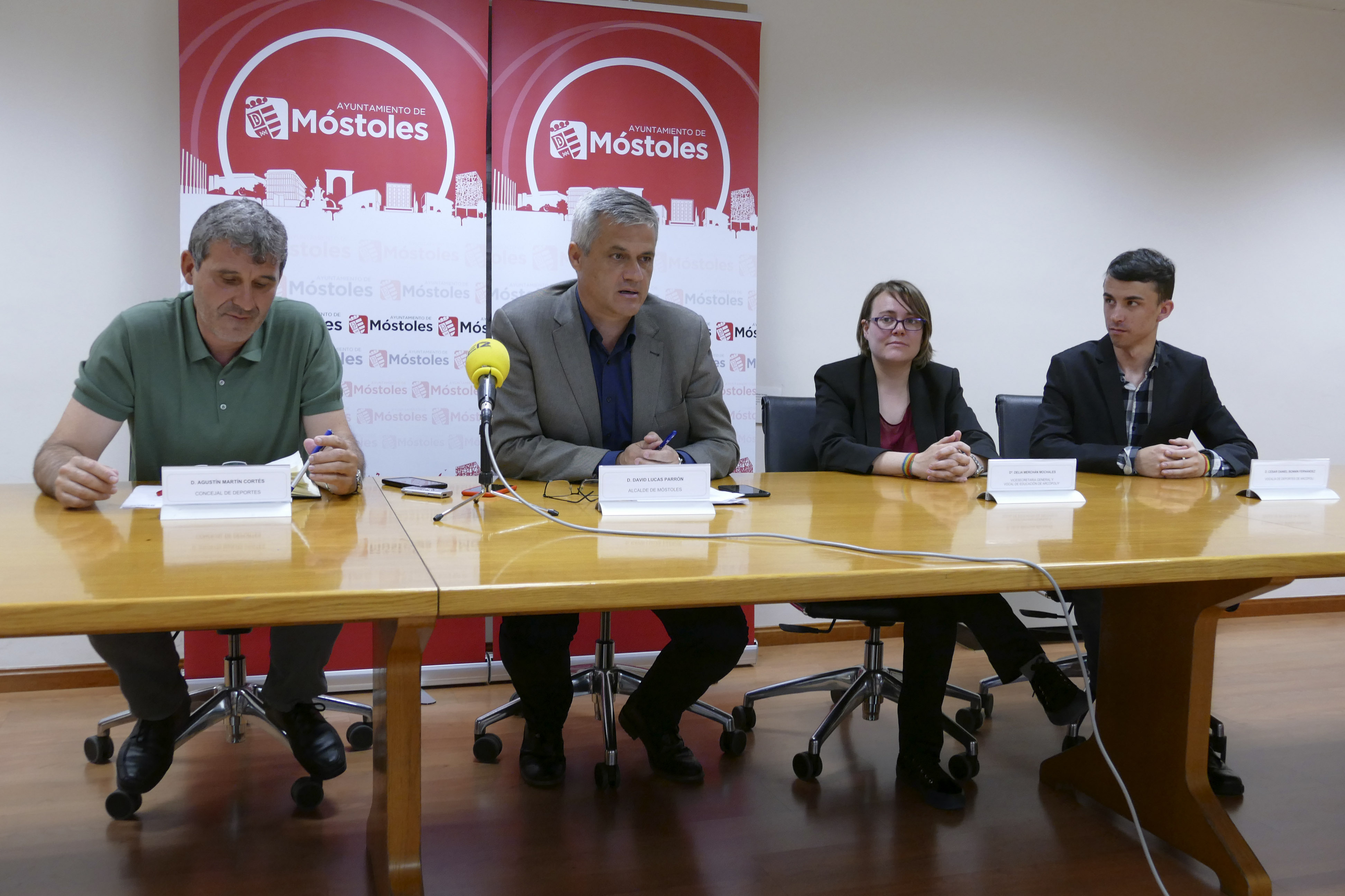 El alcalde de Móstoles, David Lucas, y el concejal de Deportes, Agustín Martín, acompañados por la vicesecretaría general de Arcópoli, Delia Merchán Mochales, y la vocalía de deportes de Arcópoli, César Daniel Bonnini, han presentado esta mañana la `I Carrera LGTBI 5 km de color Móstoles´.