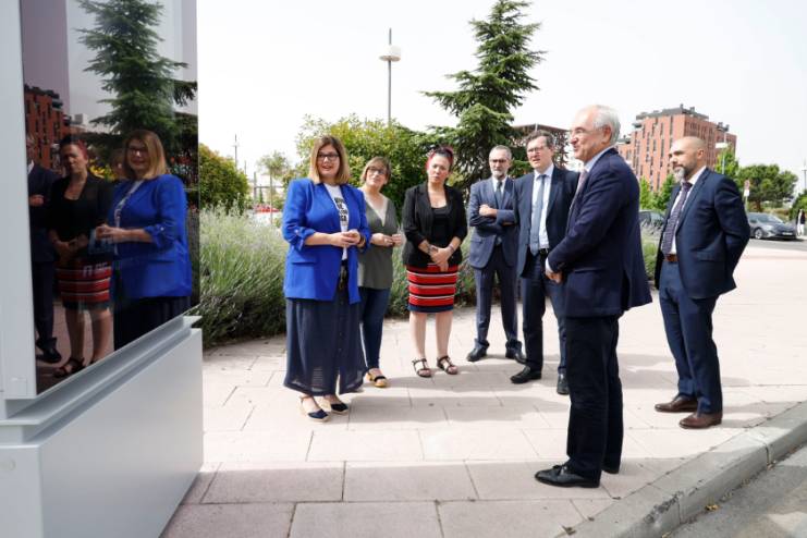 La Alcaldesa, Noelia Posse, acompañada de la Concejala de Presidencia y Desarrollo Urbano, Marisa Ruiz, el Consejero Delegado de JCDecaux, Alexandre Roubaud, y el Director General de JCDecaux, Carlos Barón, y la Portavoz de Podemos, Mónica Monterreal, han presentado esta mañana el formato de los nuevos elementos de Mobiliario Urbano como Punto de Información (MUPI) digitales que se están distribuyendo por diferentes lugares de Móstoles dentro del plan de mejora de la comunicación exterior con el ciudadano.