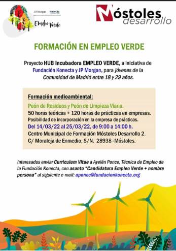 Formación gratuita para jóvenes de Móstoles en puestos del sector medioambientalFormación gratuita para jóvenes de Móstoles en puestos del sector medioambientalLa Fundación Konecta y JP Morgan en colaboración con Móstoles Desarrollo ponen en marcha el proyecto "HUB Incubadora Empleo Verde", mediante el cual se formará a jóvenes de entre 18 y 29 años sin cualificación específica en puestos del sector medioambiental. Se trata de un proyecto cuyo fin es identificar sectores de oportunidad de empleo en la economía verde y crear un modelo de inserción de jóvenes vulnerables y con escasa formación.