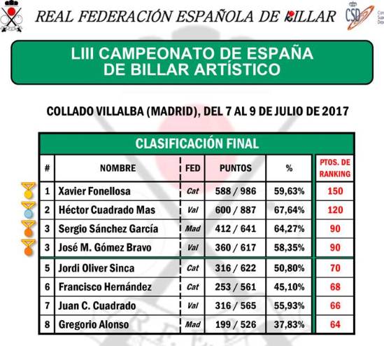 Sergio Sánchez García, jugador del Club Billar Móstoles, logra la medalla de bronce en el LIII Campeonato de España de Billar Artístico, celebrado el pasado fin de semana en Collado Villalba- Madrid.