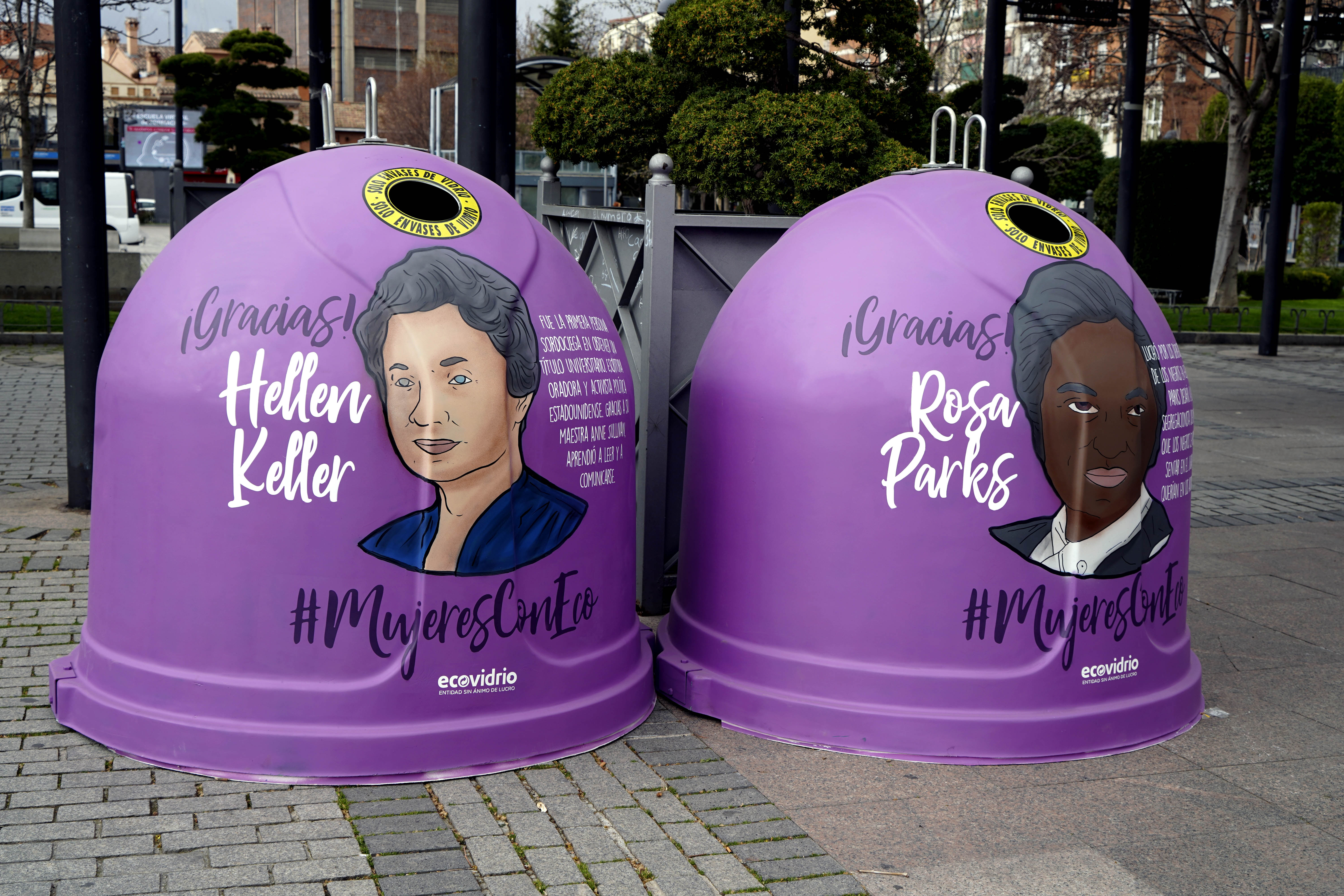 Durante las próximas semanas, contenedores morados tipo iglú pintados a mano mostrarán la imagen y una pequeña reseña de 15 mujeres que por distintas razones han dejado huella en la Historia. Se trata de mujeres como Manuela Malasaña (1791-1808), una heroína anónima que destacó durante la sublevación del 2 de Mayo; Elena Maseras (1853-1905) que fue la primera mujer en España que pudo matricularse en la Universidad sin tener que ir vestida de hombre; personalidades como Hellen Keller (1880-1968), primera persona sordociega en obtener un título universitario, o Rosa Parks (1913-2005) que destacó por su contribución a la lucha por los derechos civiles de los afroamericanos en Estados Unidos.