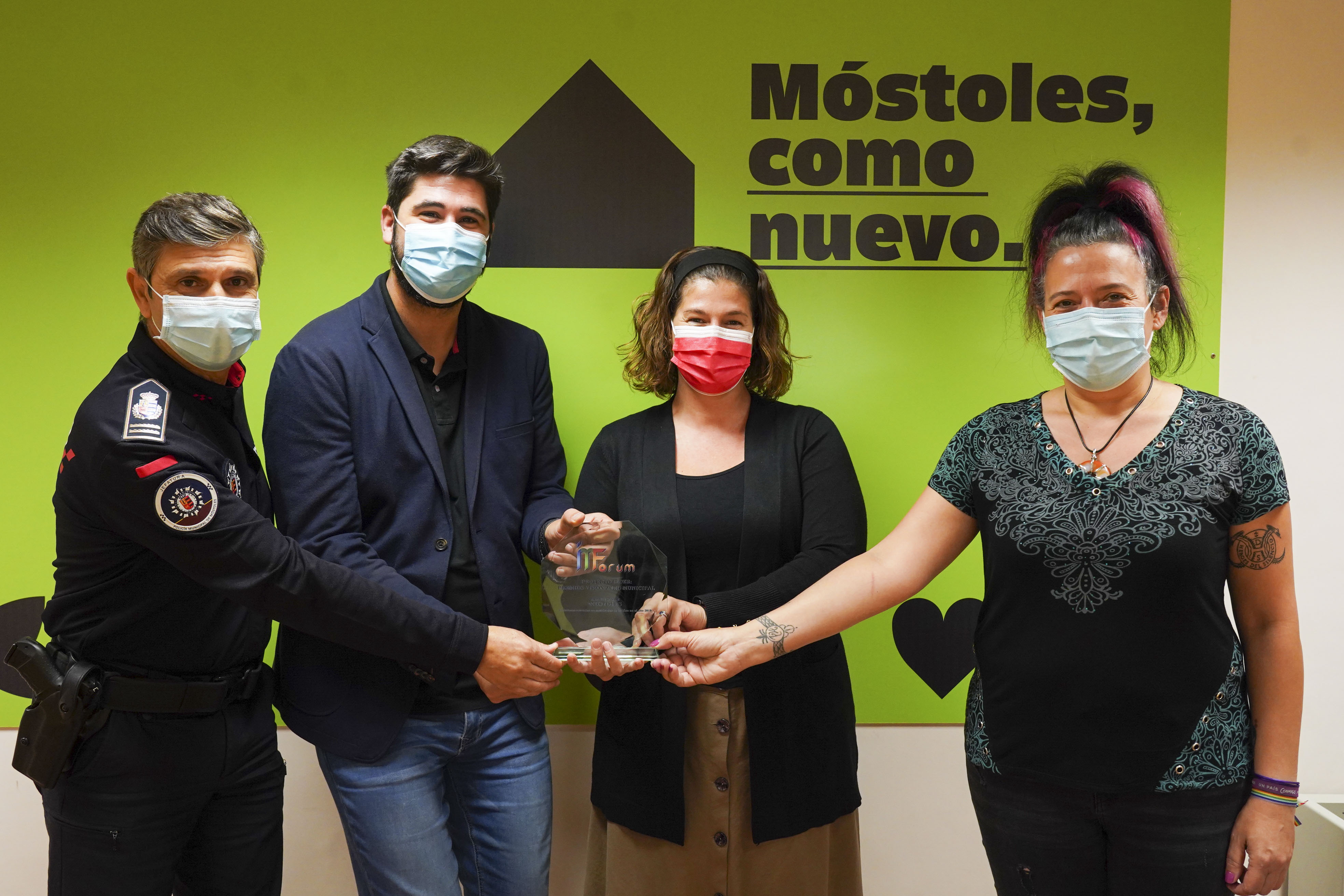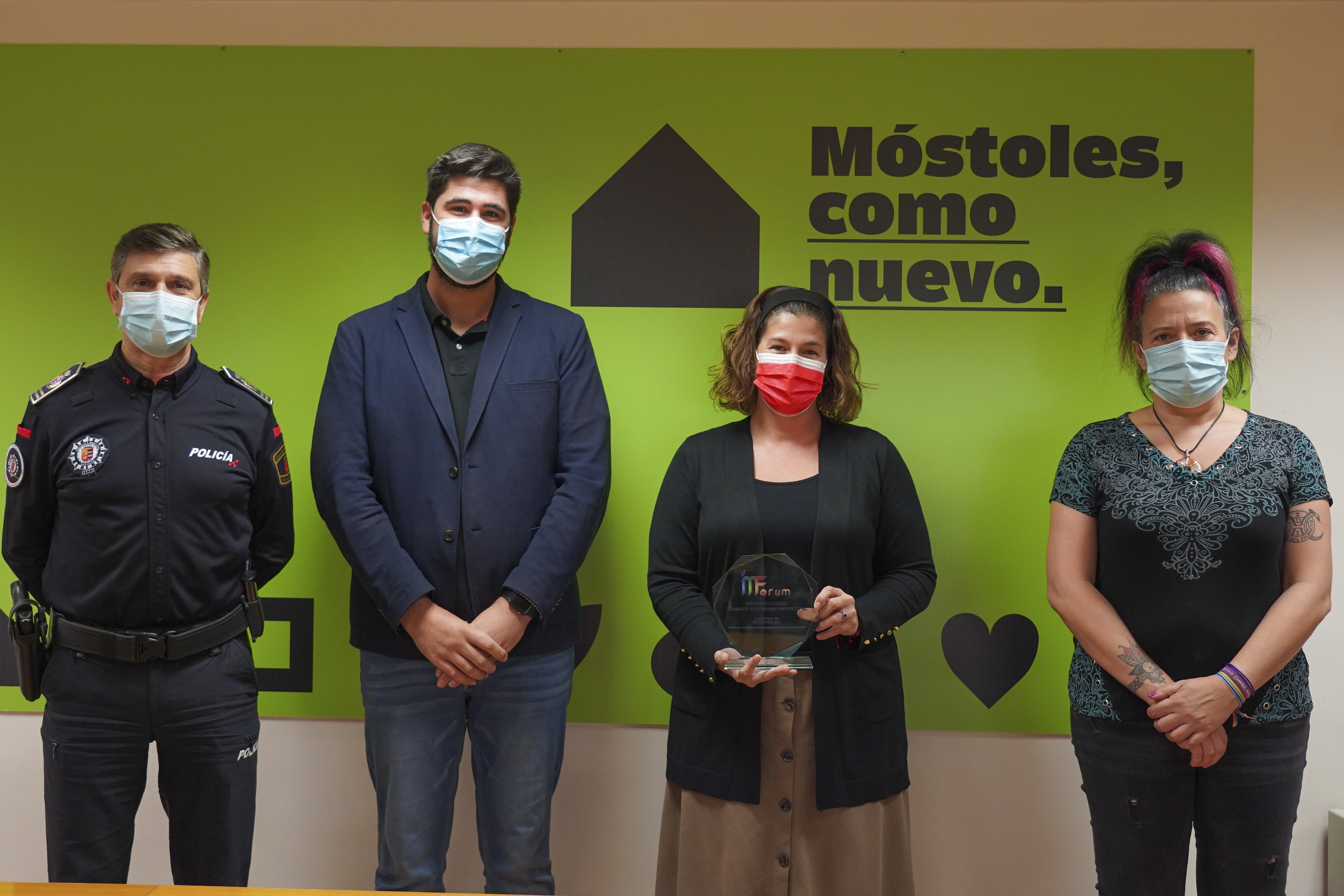 La Alcaldesa Noelia Posse, el Concejal de Seguridad, Alex Martín, y el Jefe de Policía Municipal de Móstoles, Juan Manuel Arribas, y la Portavoz de Podemos, Mónica Monterreal, han mostrado hoy el galardón que reconoce la labor del Gobierno Local para tratar de reducir el número de muertos en accidentes de tráfico y, también, la concienciación de las mostoleñas y mostoleños en el área de seguridad vial.