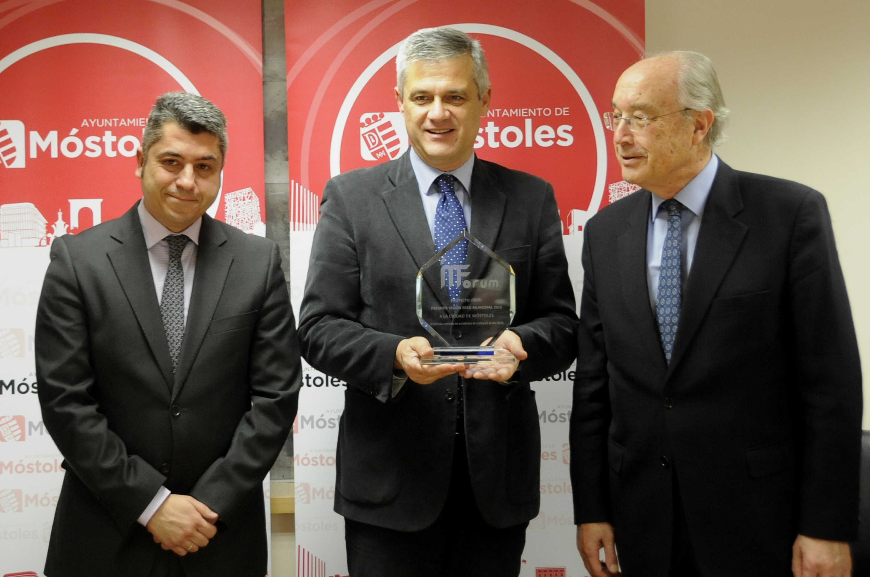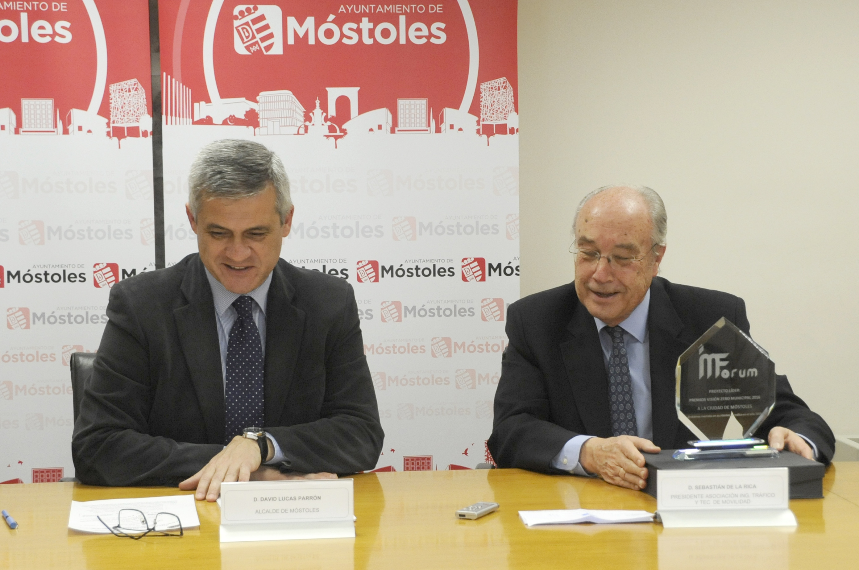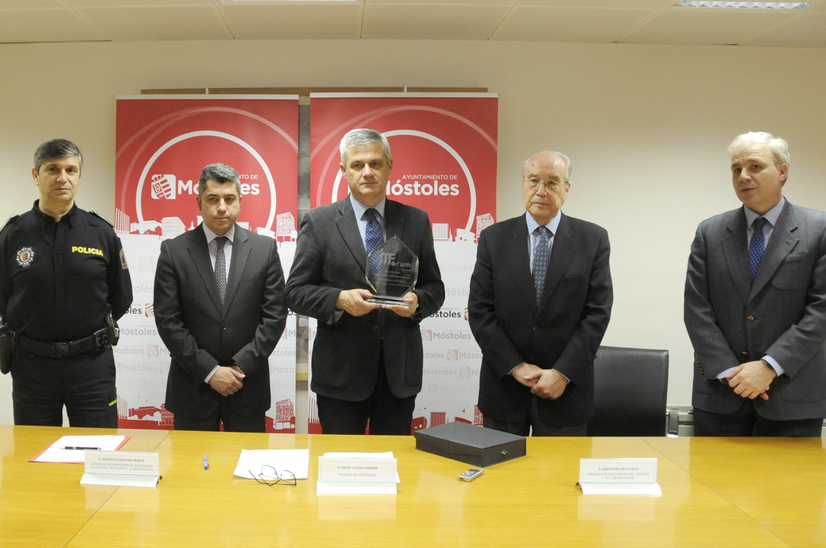 Esta mañana el alcalde de Móstoles, David Lucas, el concejal de Presidencia, Seguridad Ciudadana y Movilidad, Roberto Sánchez, y el jefe de la Policía Municipal, Juan Manuel Arribas, han recogido el premio, en la sala de juntas del Ayuntamiento, por parte de los promotores de la iniciativa, el presidente y secretario general de la Asociación de Ingenieros de Tráfico, Técnicos de Movilidad y Foro de la Movilidad Inteligente, Sebastián Rica y Jaime Huerta respectivamente.