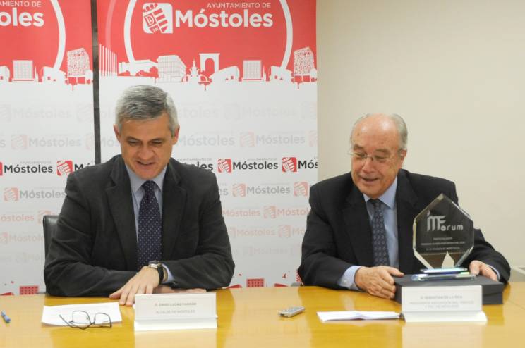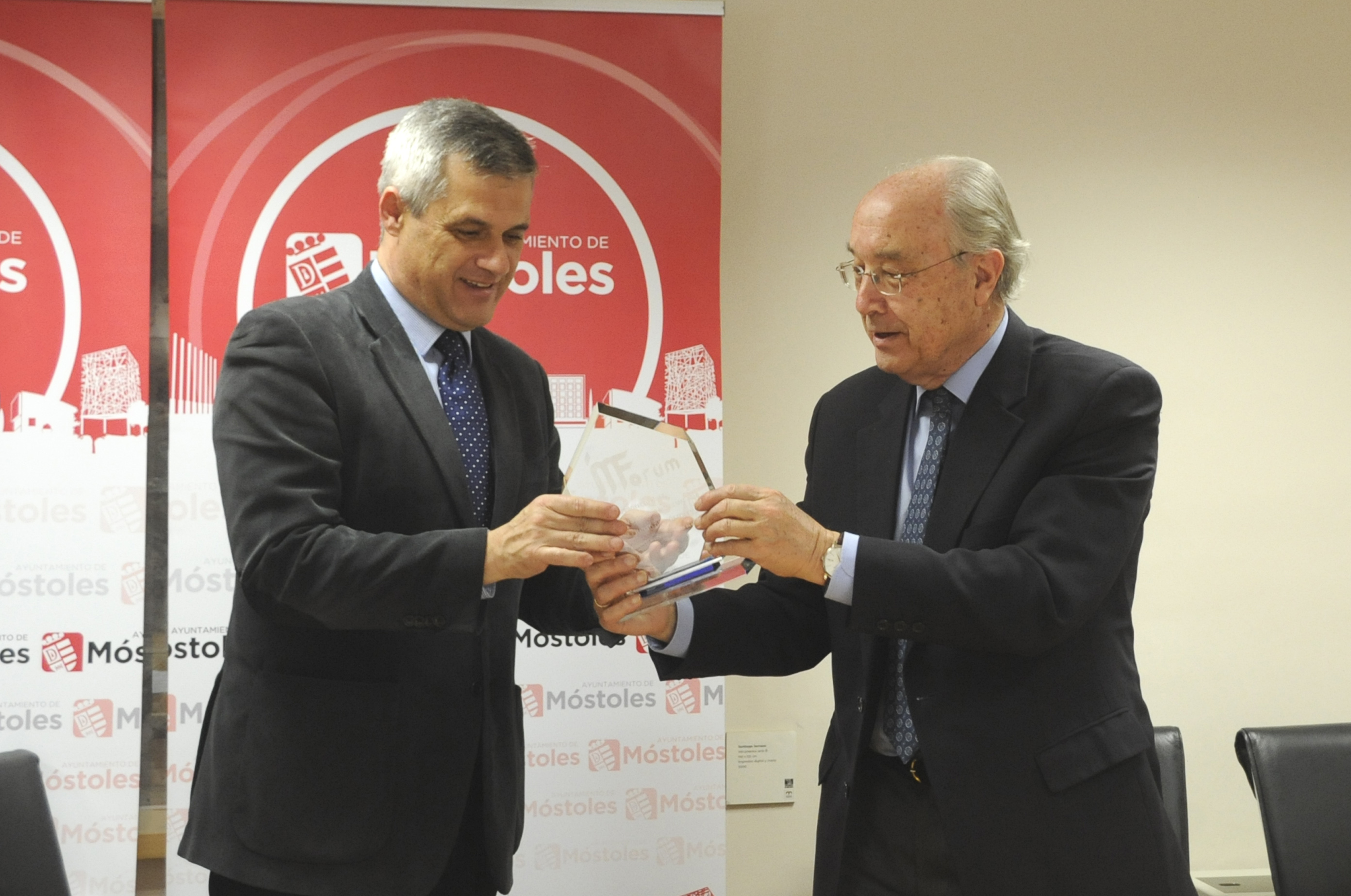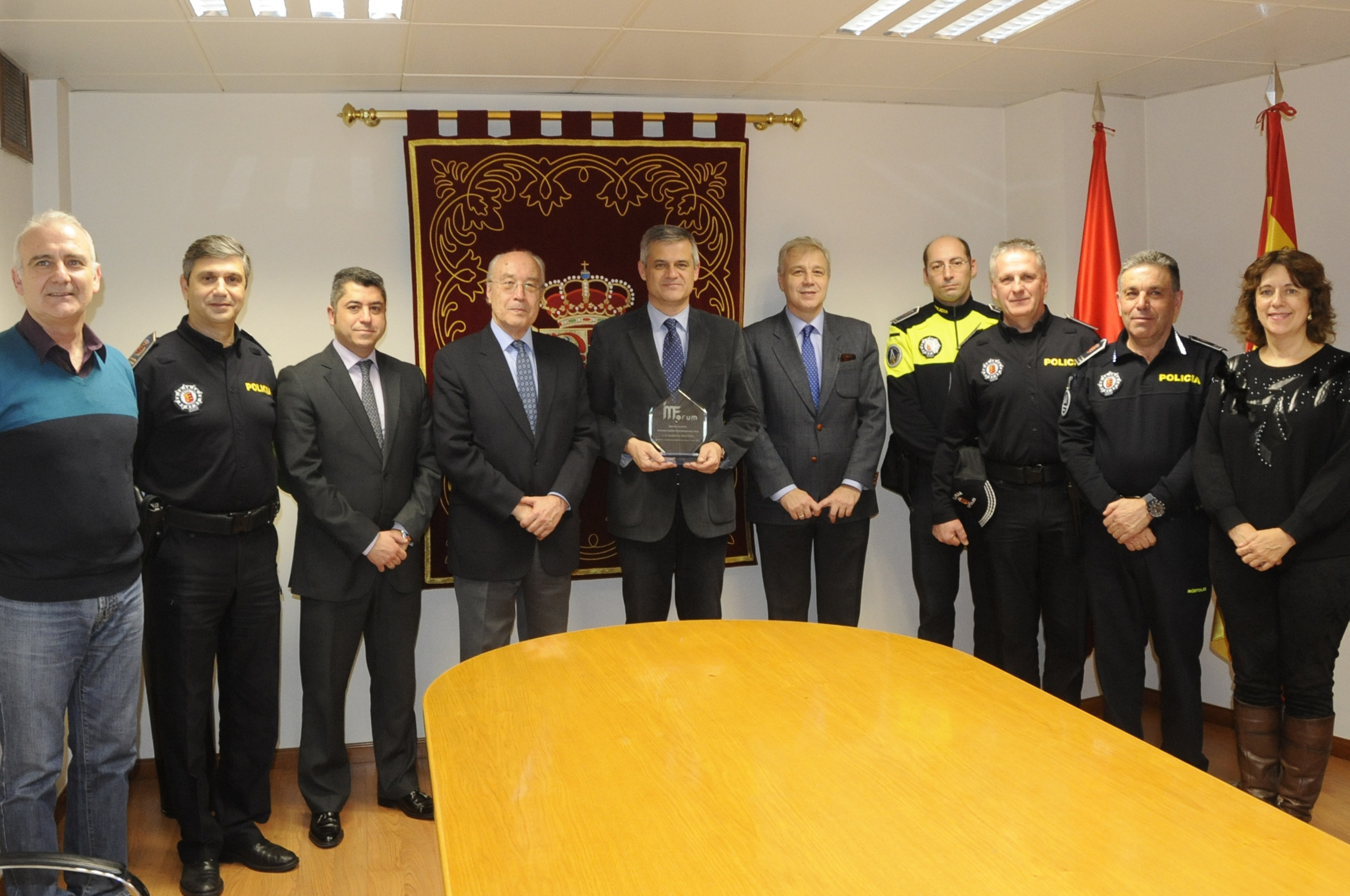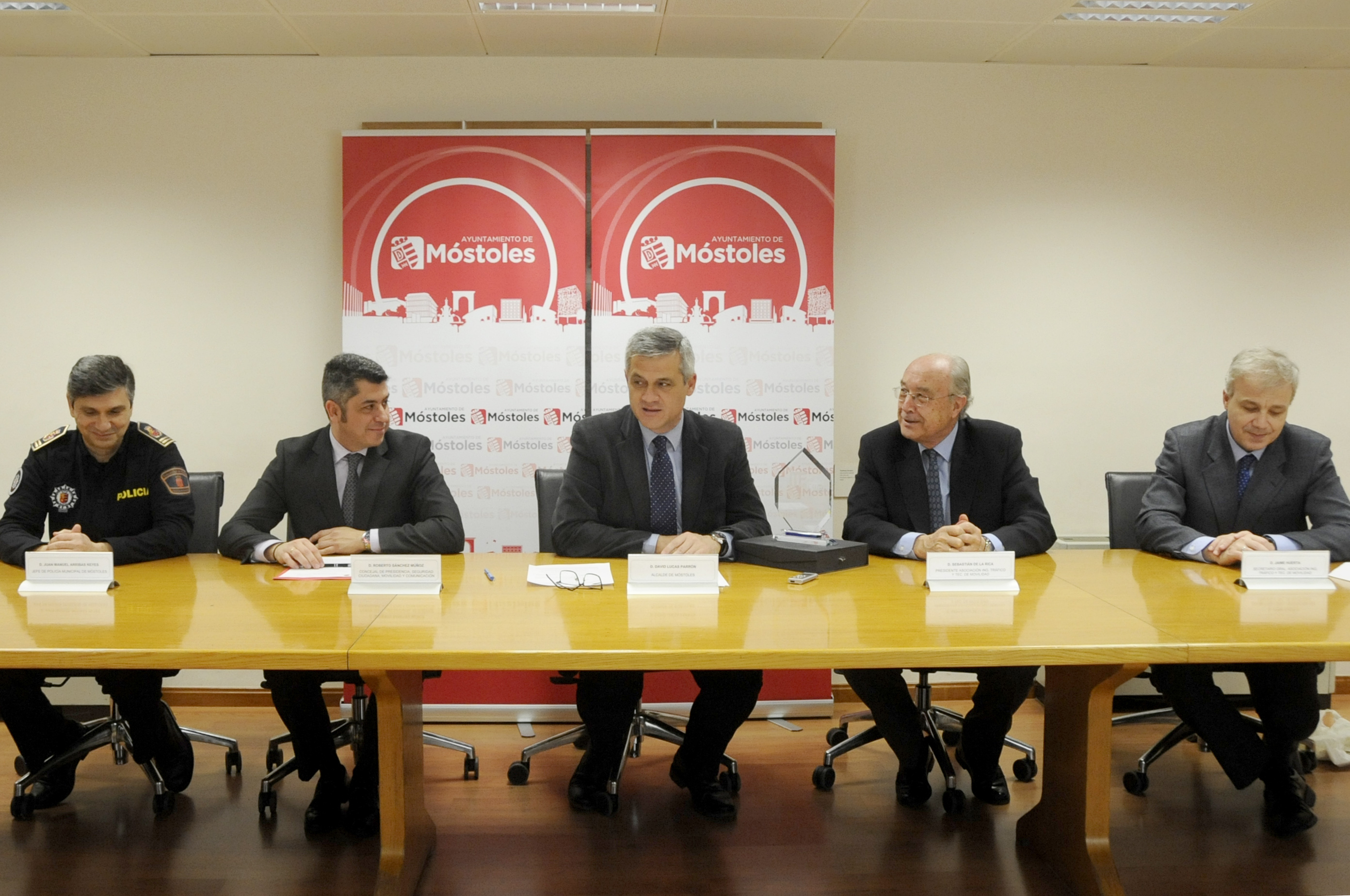 Esta mañana el alcalde de Móstoles, David Lucas, el concejal de Presidencia, Seguridad Ciudadana y Movilidad, Roberto Sánchez, y el jefe de la Policía Municipal, Juan Manuel Arribas, han recogido el premio, en la sala de juntas del Ayuntamiento, por parte de los promotores de la iniciativa, el presidente y secretario general de la Asociación de Ingenieros de Tráfico, Técnicos de Movilidad y Foro de la Movilidad Inteligente, Sebastián Rica y Jaime Huerta respectivamente.