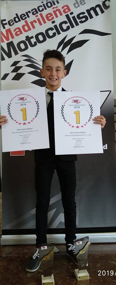 motociclista mostoleño MarcoImagen en alta resolución. Este enlace se abrirá mediante lightbox, puede haber un cambio de contextomotociclista mostoleño MarcoEl pasado fin de semana tuvo lugar la Gala de Campeones de la Comunidad de Madrid 2018. Con el presidente de la Real Federación Motociclista Española (RFME) y el presidente de la Federación Madrileña de Motociclismo, el mostoleleño Marco García fue galardonado con los trofeos que le acreditan como Campeón de SM 65 y Campeón de SM 85. Con esta entrega de premios Marco García cierra una gran temporada de trabajo y de éxitos.