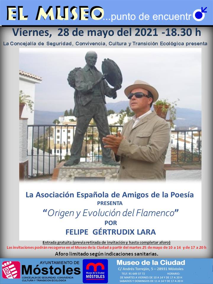 El viernes 28, también en el Museo de la Ciudad. La Asociación Española de Amigos de la Poesía (ASEAPO) presenta la conferencia: "Origen y evolución del Flamenco", por Felipe Gértrudix Lara. A las 18.30 horas. Entrada gratuita previa retirada de invitación y hasta completar el aforo limitado, según indicaciones sanitarias. Las entradas podrán recogerse en el Museo a partir del martes 25 de mayo de 10:00 a 14:00 y de 17:00 a 20:00 h.