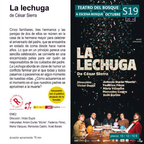 El sábado 19 de octubre llegará "La Lechuga", en el Teatro del Bosque a las 20 horas y el domingo 20 el espectáculo de teatro familiar "La luna en el jardín" a las 12 y a las 13,15 horas en el Teatro El Soto, dentro de la programación de `Vivo en Domingo´.