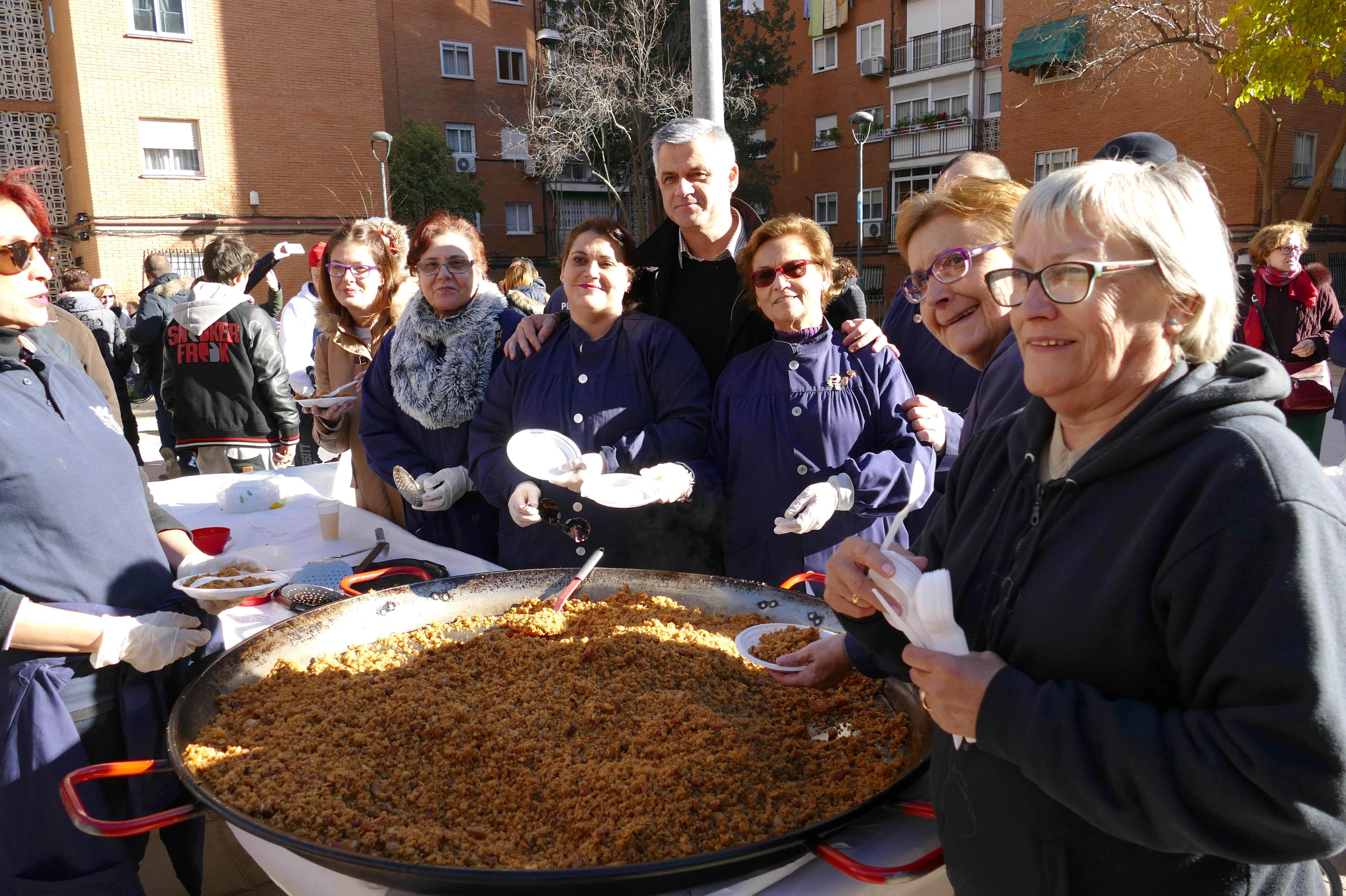 Durante toda la mañana se pusieron en marcha tres recipientes gigantes de migas para invitar a peñeros y demás vecinos, a base de 200 barras de pan, ocho kilos de ajo, panceta y chorizo y 10 litros de aceite.